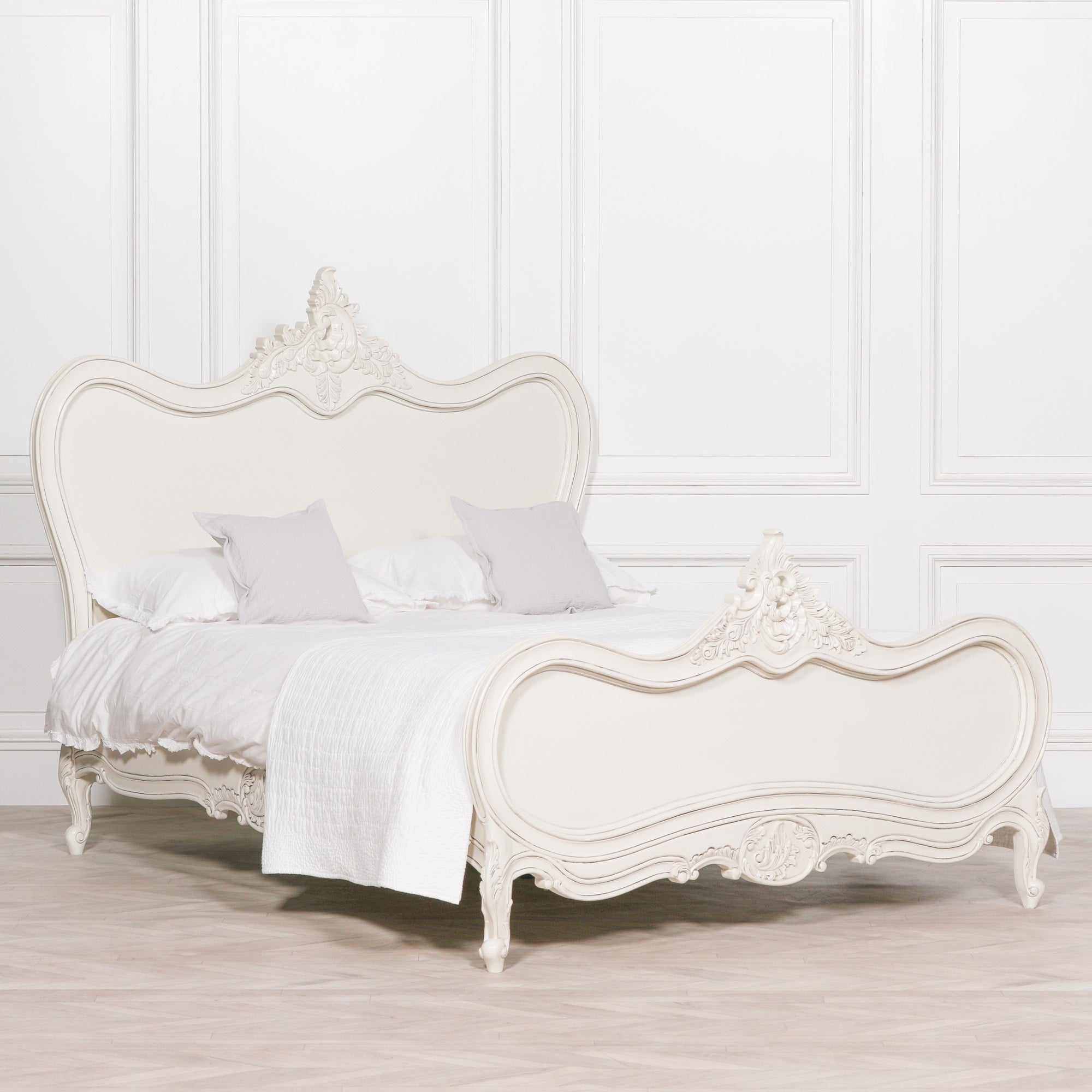 This French Chateau 5ft King Size Bed is a stunning addition to any bedroom. Featuring a white finish and intricate motif crown and legs crafted from mahogany wood, this bed exudes elegance and charm.