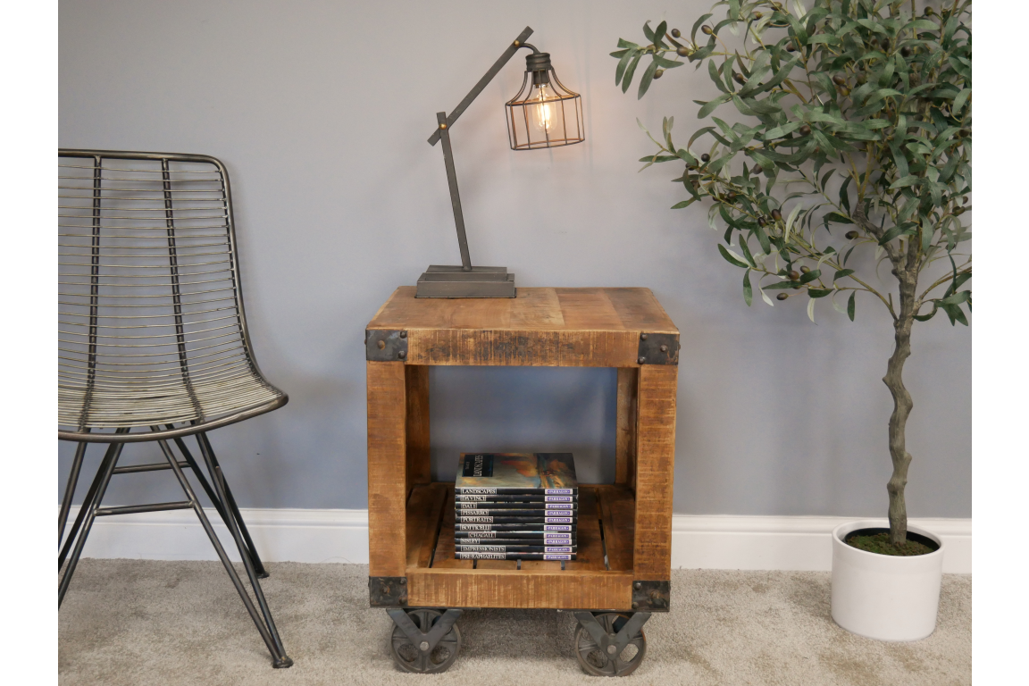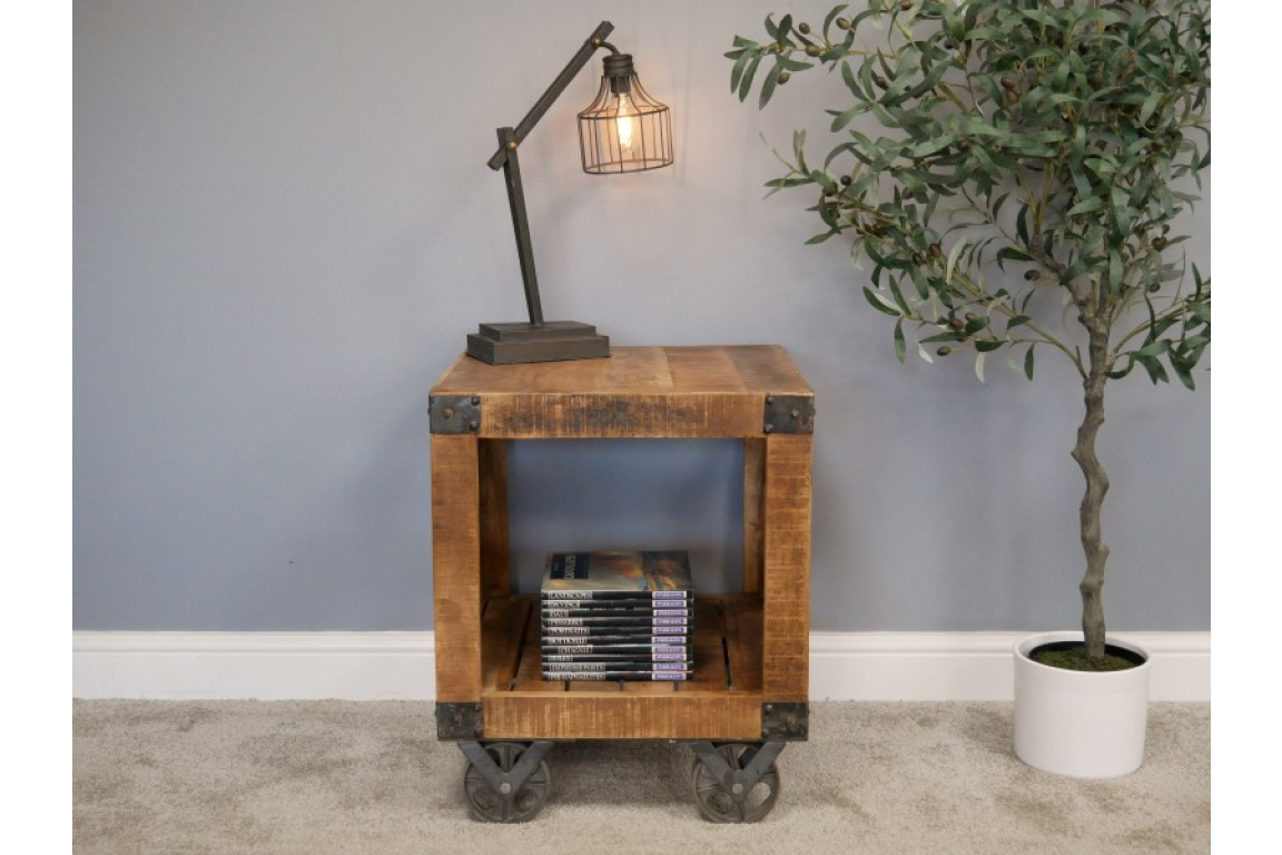 With the addition of metal wheels, this table not only offers functionality but also a hint of industrial flair. The combination of wood and metal creates a stylish contrast, making it a perfect addition to both modern and traditional interiors. Whether placed in a bedroom, living room, or hallway, this bedside/side table effortlessly combines form and function.