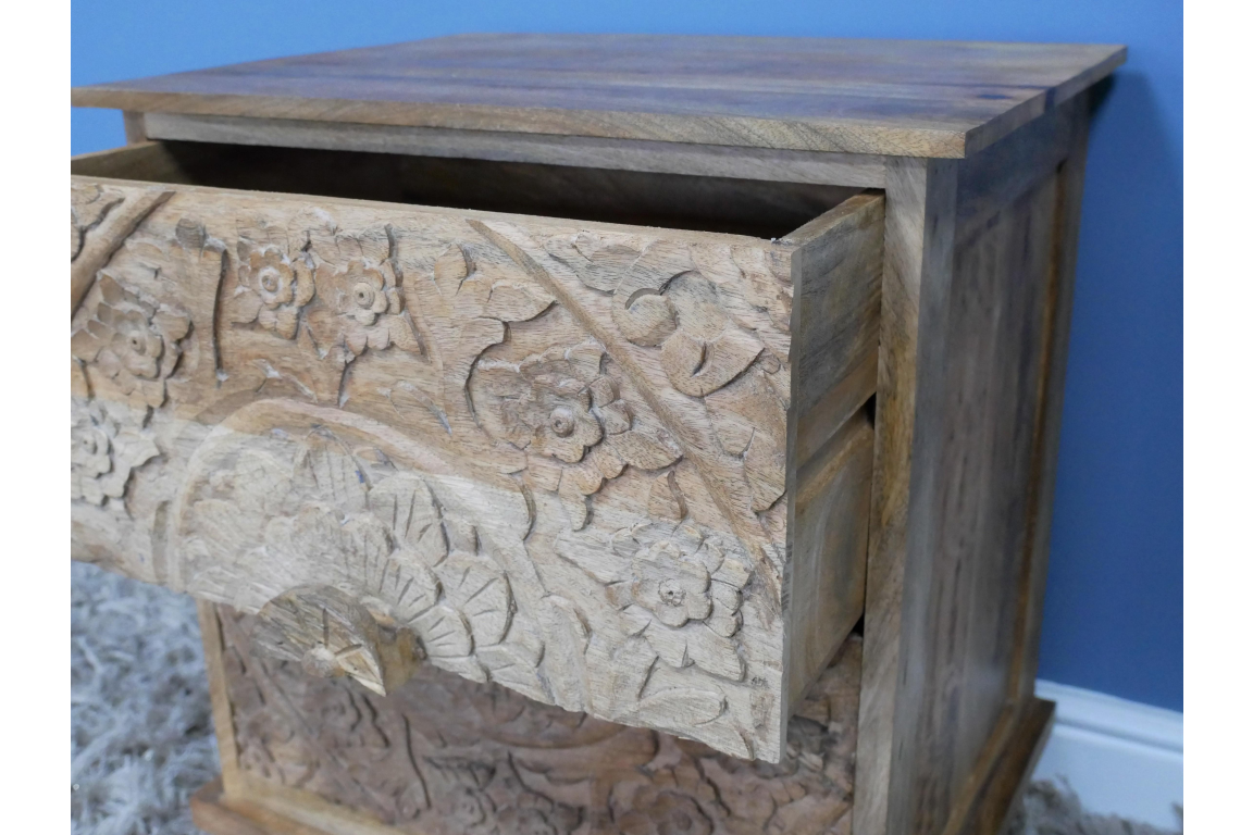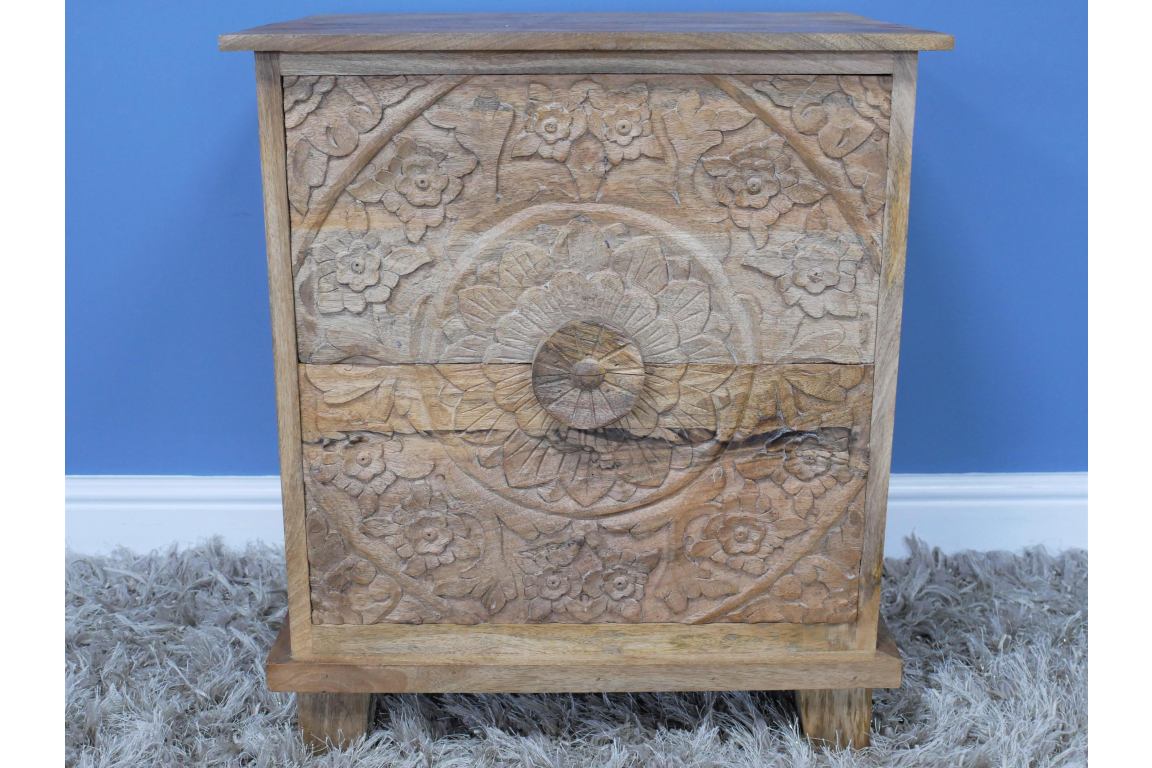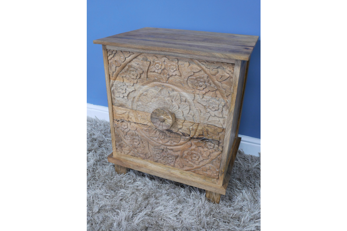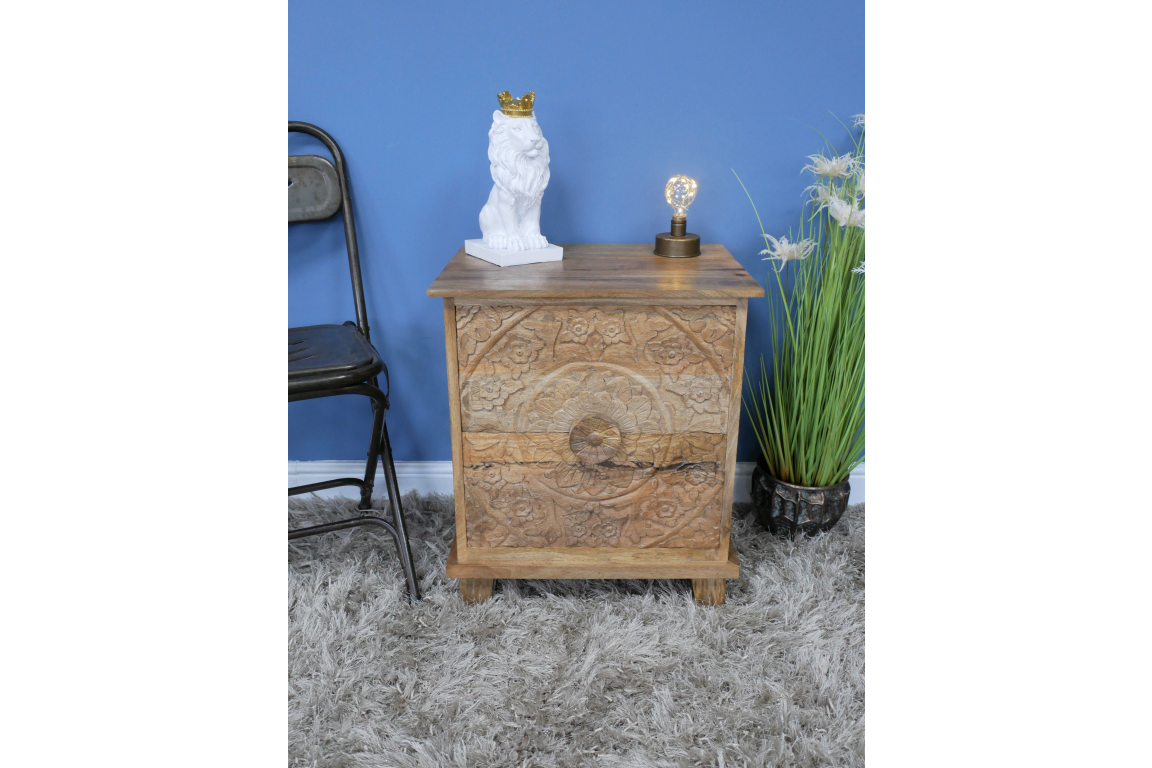 This carved bedside cabinet exudes a timeless charm with its intricate design and elegant style. Crafted from high-quality mango wood, it boasts a rich and natural finish that adds warmth to any bedroom decor. The intricate carvings on the cabinet doors and sides showcase the craftsmanship and attention to detail that went into its creation.