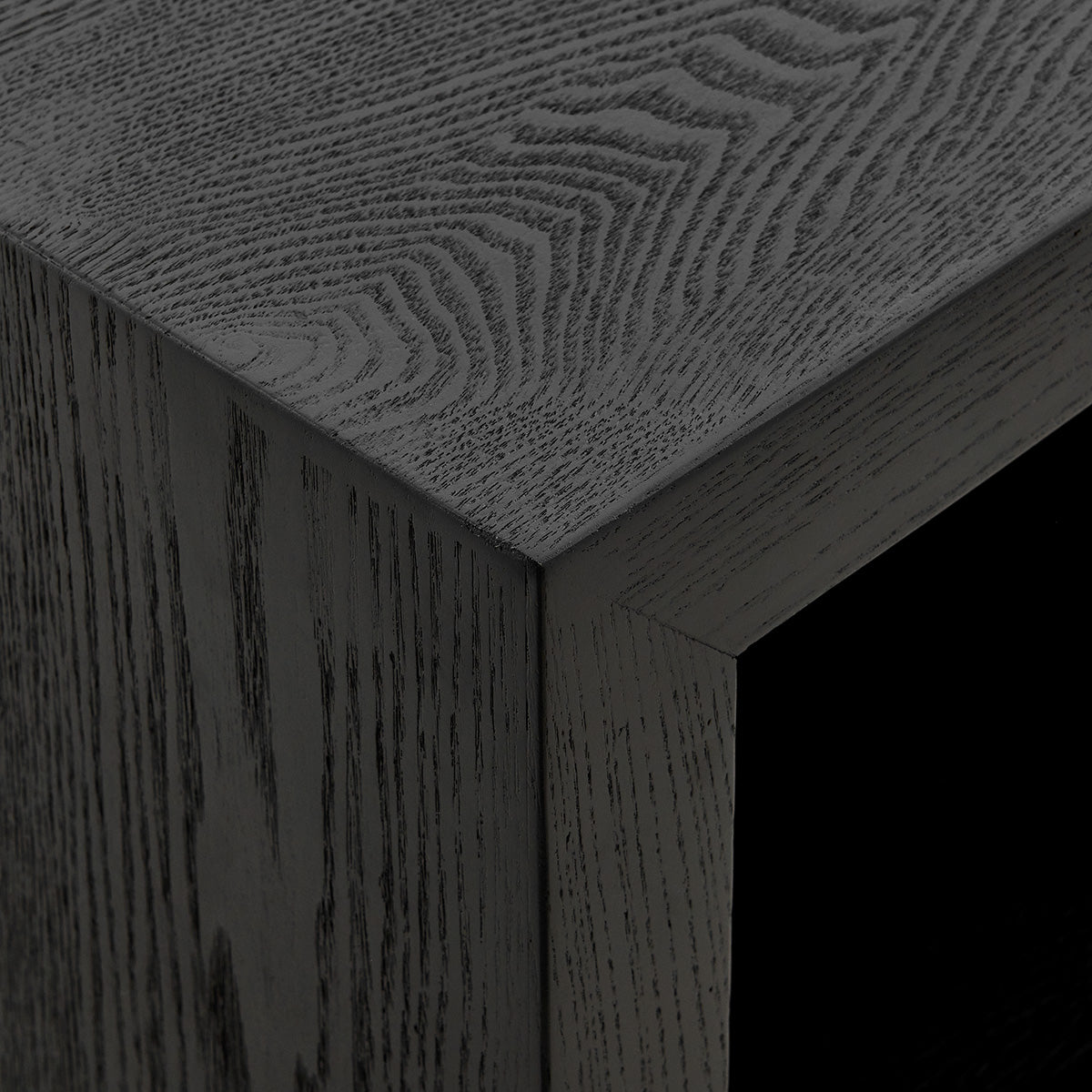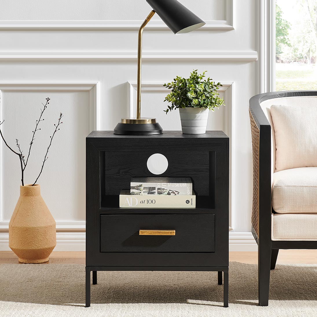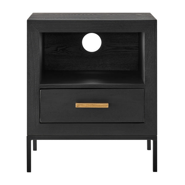 The Brixton 1 Drawer End Table exudes modern elegance with its sleek black finish and practical drawer for convenient storage. Crafted with quality construction from plywood veneer, fir, and metal, this end table is both stylish and functional.