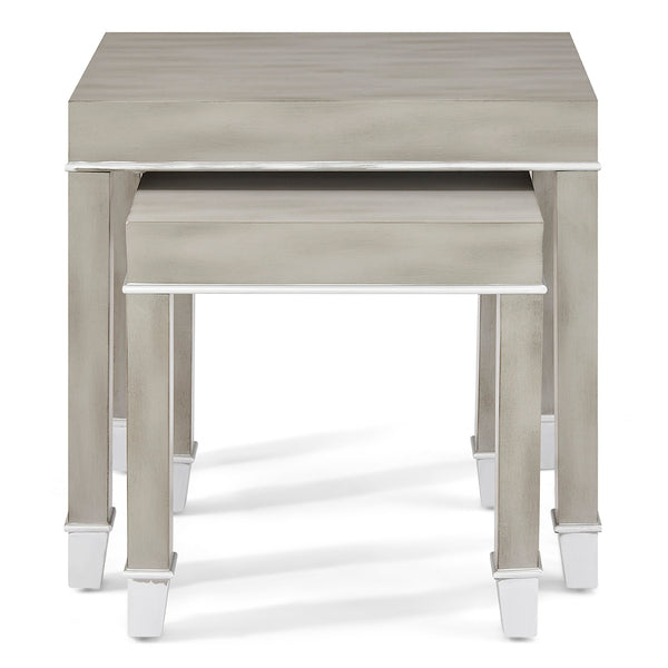 The Carter Nest of Tables is a versatile and stylish addition to any living space. Crafted with a distressed grey and silver painted finish, these tables offer a touch of elegance and charm. The set includes two tables, perfect for accommodating guests or simply enjoying a cup of coffee.