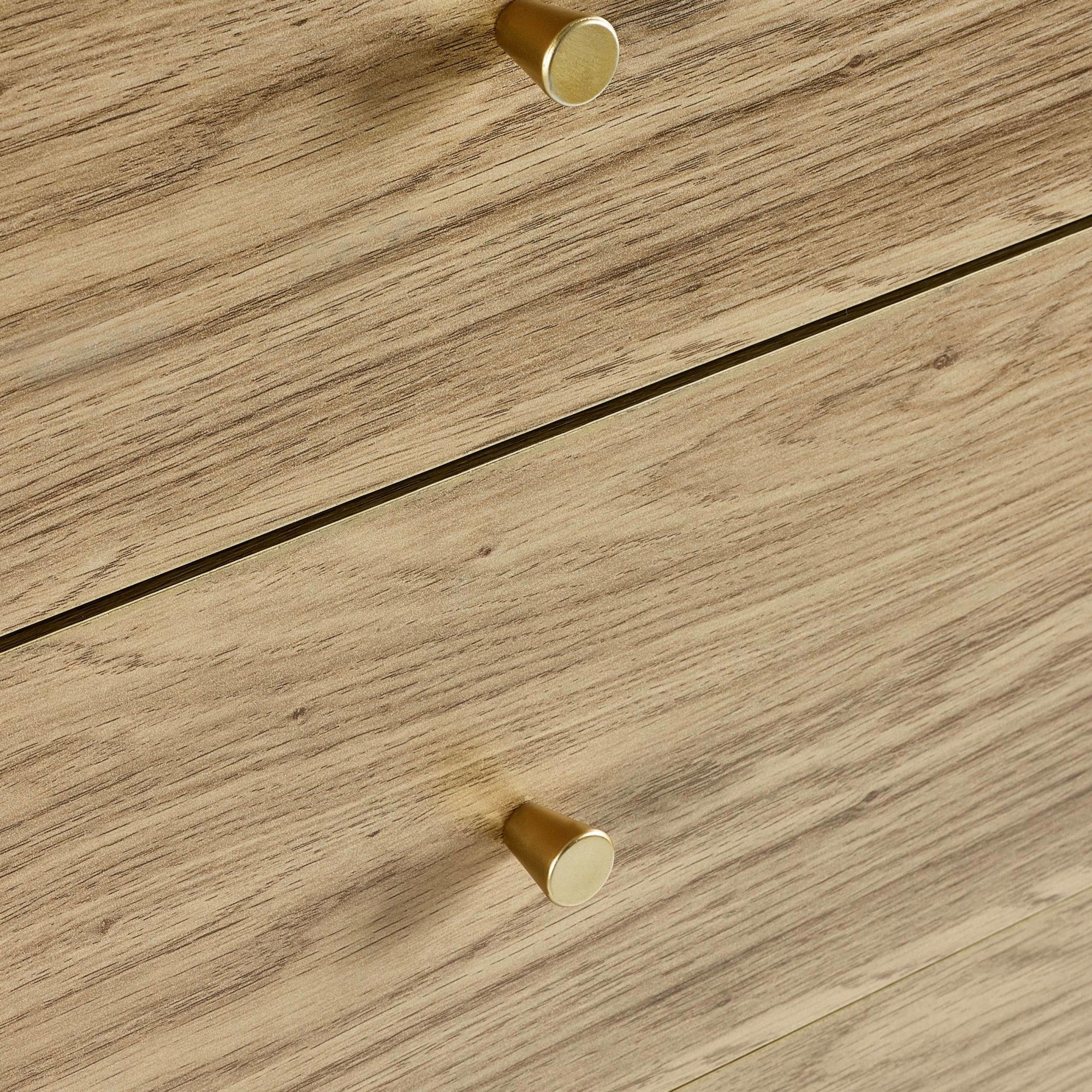 Maximise storage without sacrificing style with the Ingrid 5 Drawer Chest. This tall, elegant piece adds warmth and character to any room with its textured wood-effect finish. The gently curved edges and gold-tone handles enhance its sophisticated look, while five spacious drawers offer ample storage to keep your belongings neatly organised. Easy assembly ensures quick enjoyment.