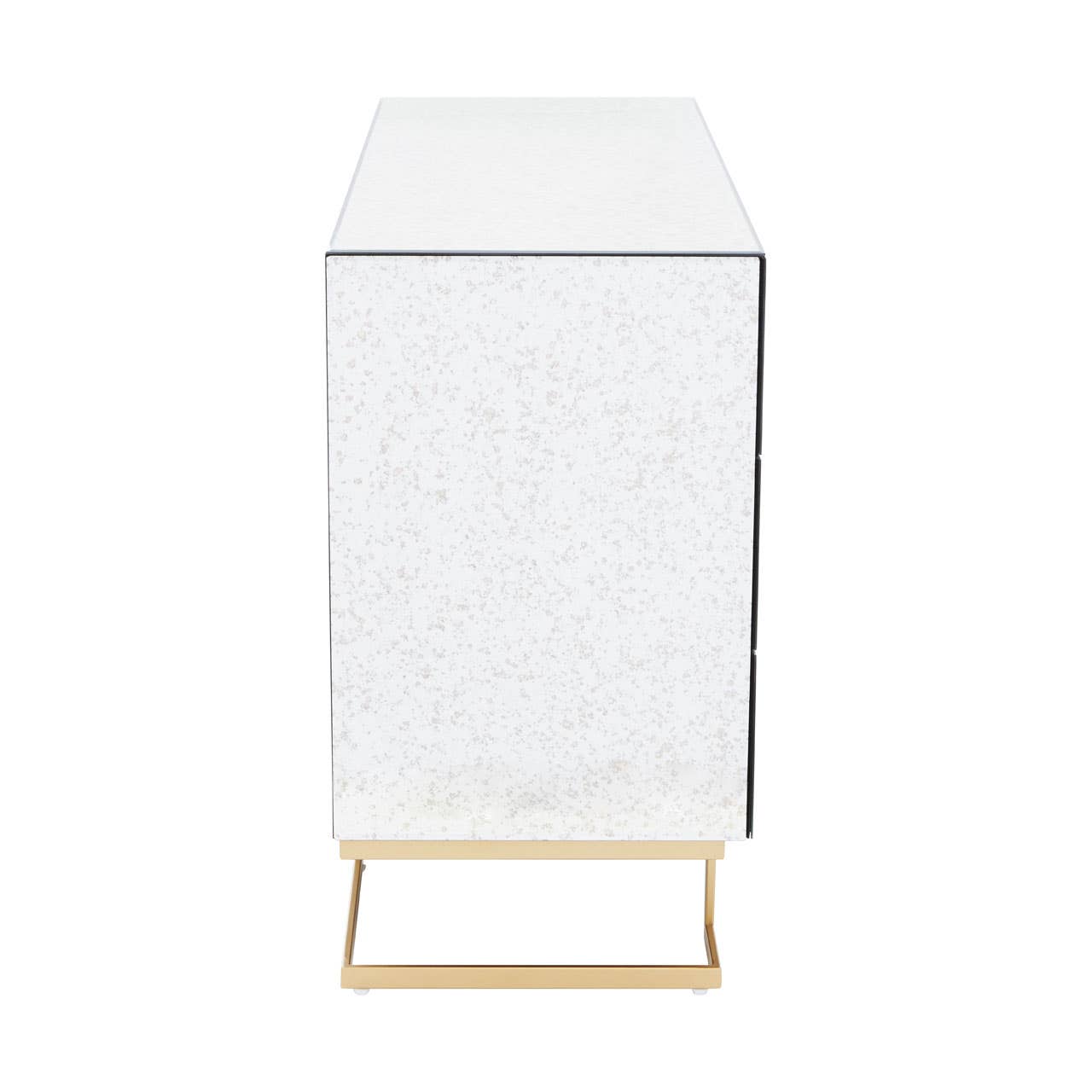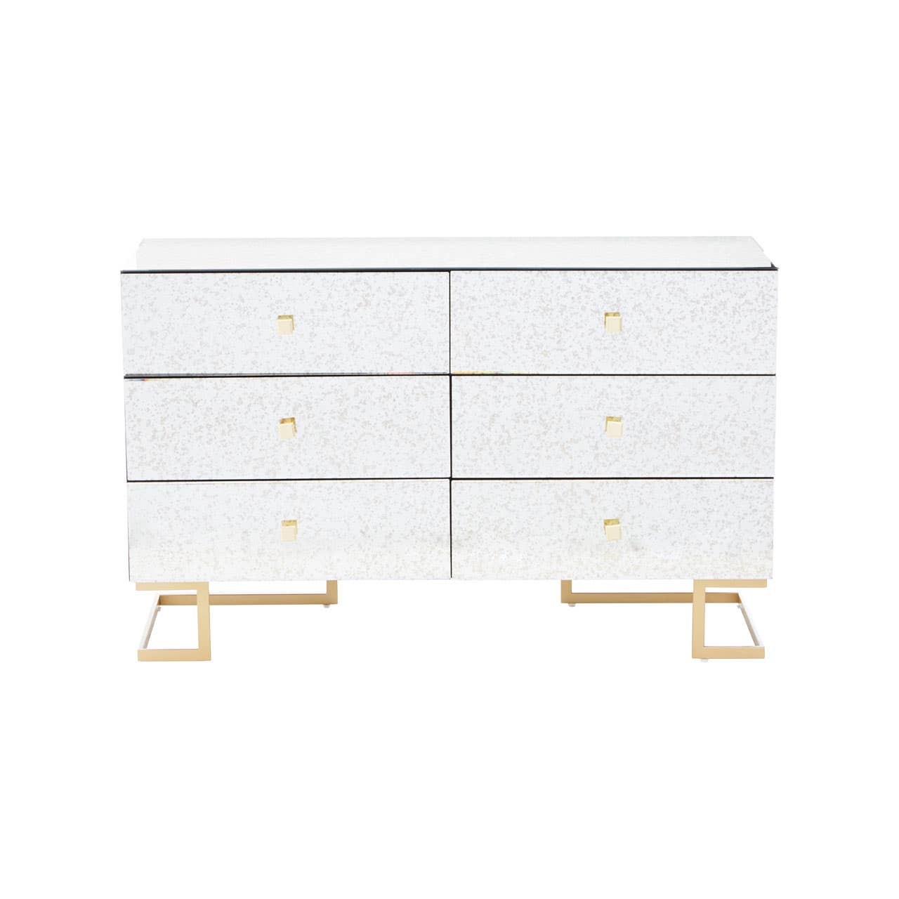 Enhance your decor with a stylish six-drawer chest featuring a reflective antique mirror design, brass-finished pulls, and a sleek sledge base.