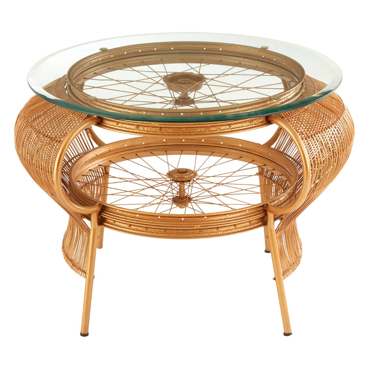 Elevate your living space with our Golden Bamboo Glass Top Table. The exquisite design features a clear glass top that beautifully showcases the intricate bicycle spoke style frame finished in luxurious gold. Crafted from durable bamboo and iron, this table effortlessly combines style and functionality. Add a touch of elegance to your home with this stunning statement piece.