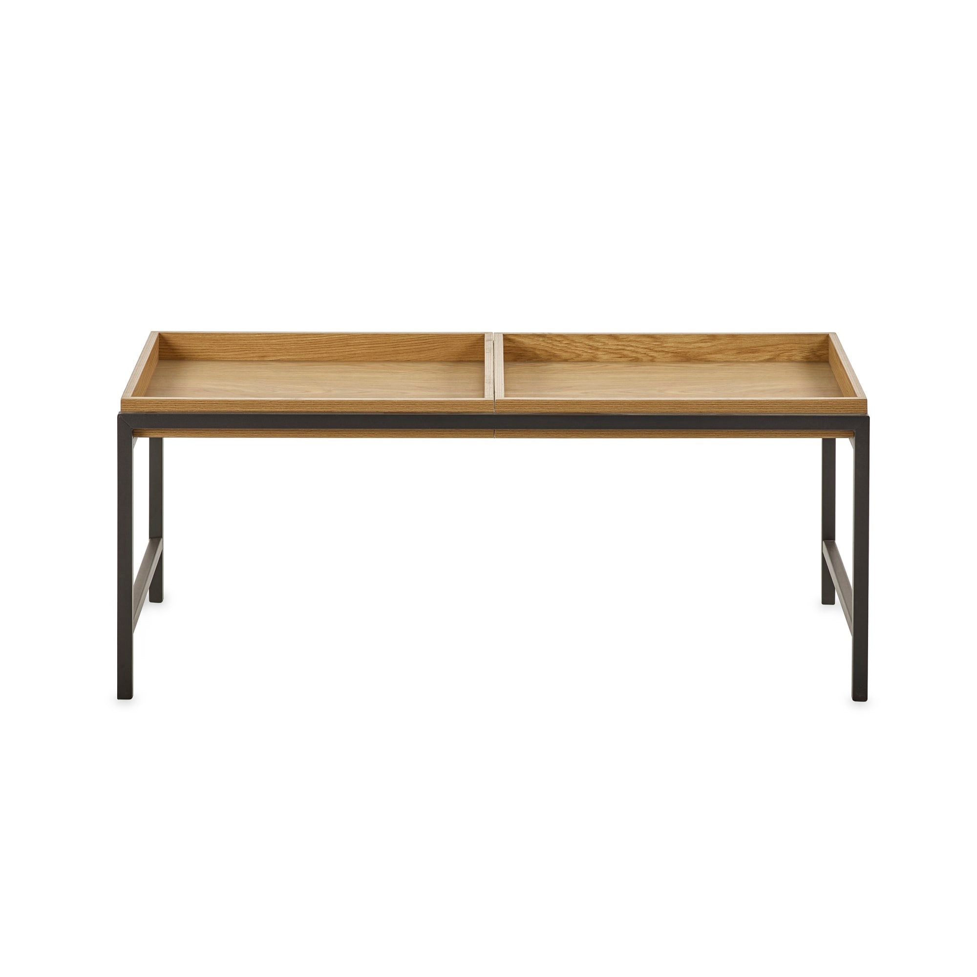 Refresh your living room with the Reuben Tray Coffee Table in Light Oak. This sleek tray-style table combines contemporary design with a warm, natural finish. The wood-effect top adds texture and character, while the open black metal frame keeps the look light and airy. The trays can be easily flipped or removed, offering flexible use and added convenience. With subtle raised edges to keep items secure, it's perfect for drinks, books, or decorative accents. Self-assembly is required.