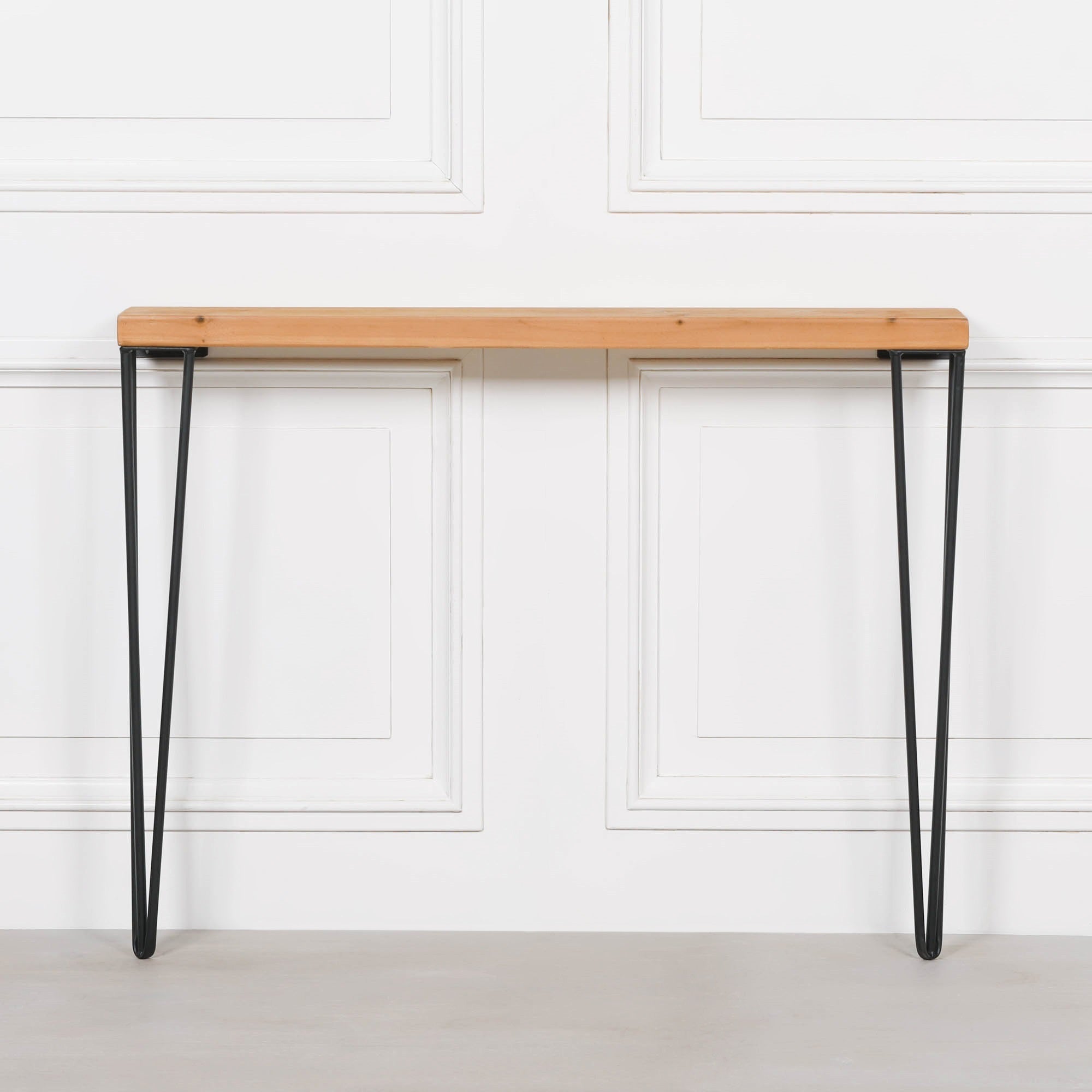 Add a touch of rustic charm to your hallway with this 77cm console table. Crafted from pine wood with black metal hairpin legs, it boasts a stylish and minimalist design.
