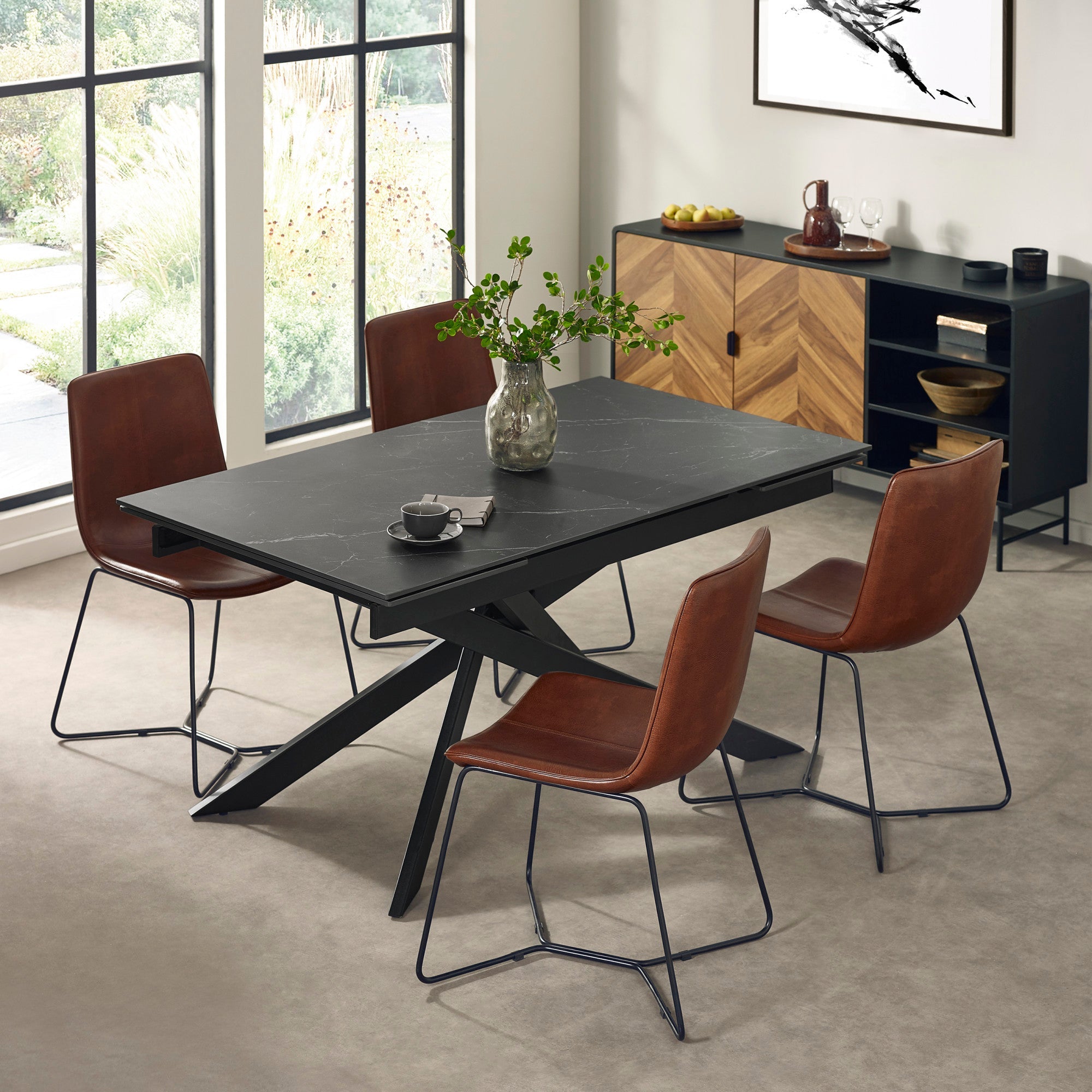 Bring a refined industrial touch to your space with this set of 2 Joren Dining Chairs in brown. Upholstered in soft tan PU leather with a subtle grain finish, they offer a sleek balance of comfort and modern edge. The curved backrest and padded seat provide lasting support, making them a practical choice for everyday dining or extended gatherings. Powder-coated black iron legs complete the look with a clean, graphic silhouette. Perfect for dining tables, breakfast nooks, or even as extra seating in open-plan kitchens or living areas. Assembly required. Table Sold Separately.