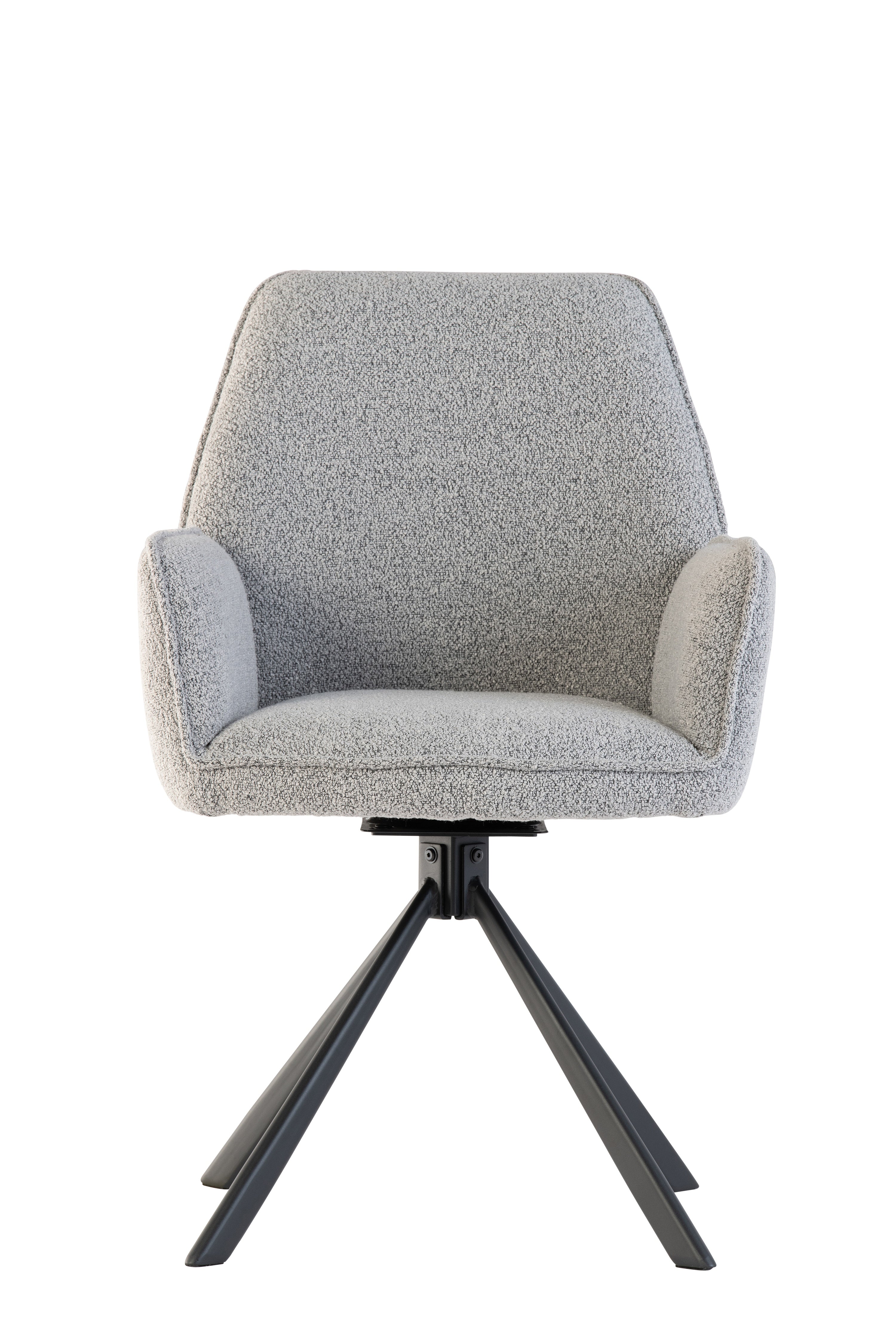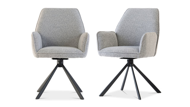 Introducing a stunning modern dining chair that effortlessly combines style and functionality. With its 360-degree swivel motion, this chair allows for easy movement and flexibility, making it perfect for both dining and socialising. Upholstered in elegant light grey boucle fabric, it adds a touch of sophistication to any dining space, while the sleek black legs provide a striking contrast that enhances its contemporary appeal.
