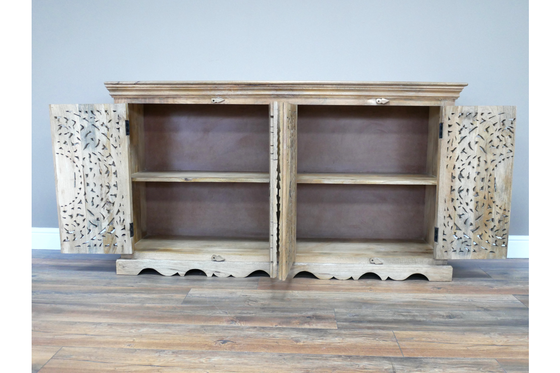 This intricately carved cabinet exudes timeless elegance with its ornate design and rich craftsmanship. Crafted from luxurious mango wood, each piece showcases the natural beauty and durability of the material. The intricate carvings on the cabinet doors add a touch of artisanal charm, making it a focal point in any living space.