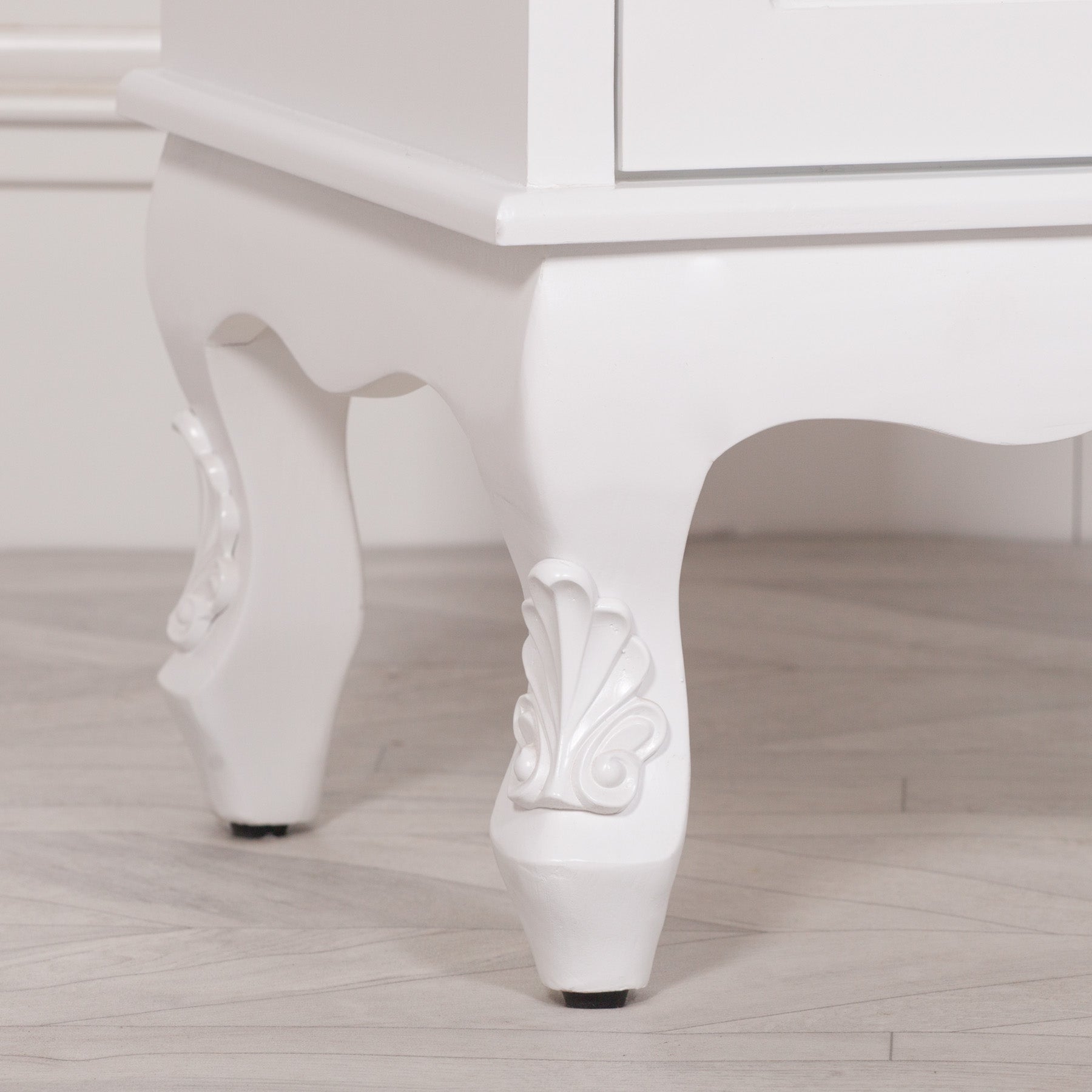 This French White Display Cabinet exudes elegance and charm with its French antique design. Featuring a tempered glass shelf and intricate motif detailing, it is a perfect blend of style and functionality.