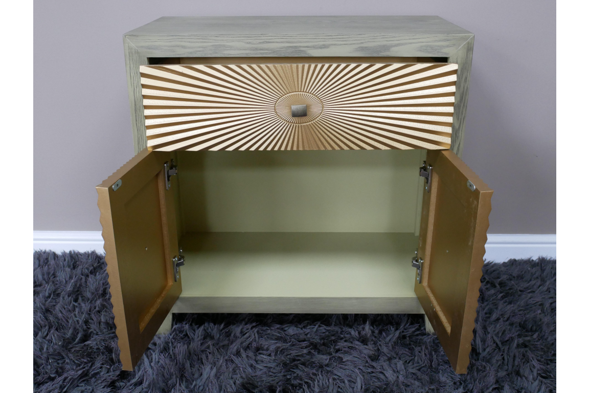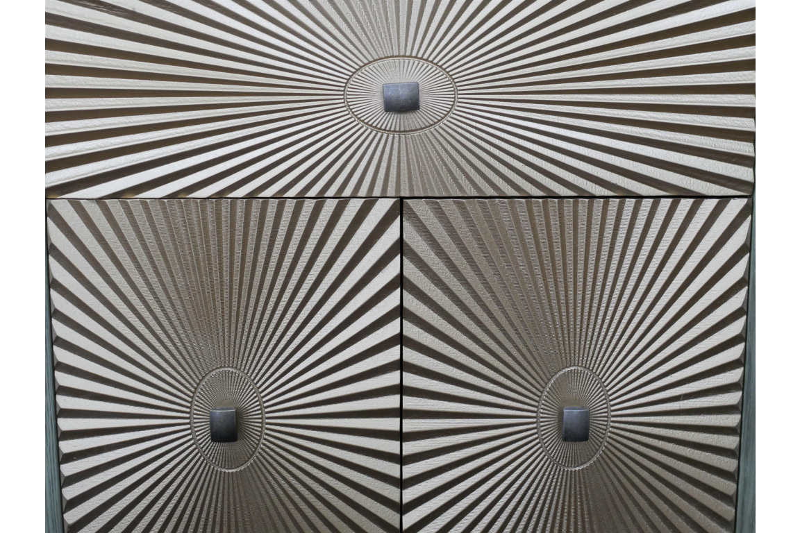 The Retro Starburst Cabinet exudes mid-century modern charm with its sleek design and vintage flair. This eye-catching piece features a unique starburst pattern on its cabinet doors, adding a touch of retro elegance to any room. The tapered legs and clean lines give it a classic silhouette that complements both contemporary and traditional decor styles.