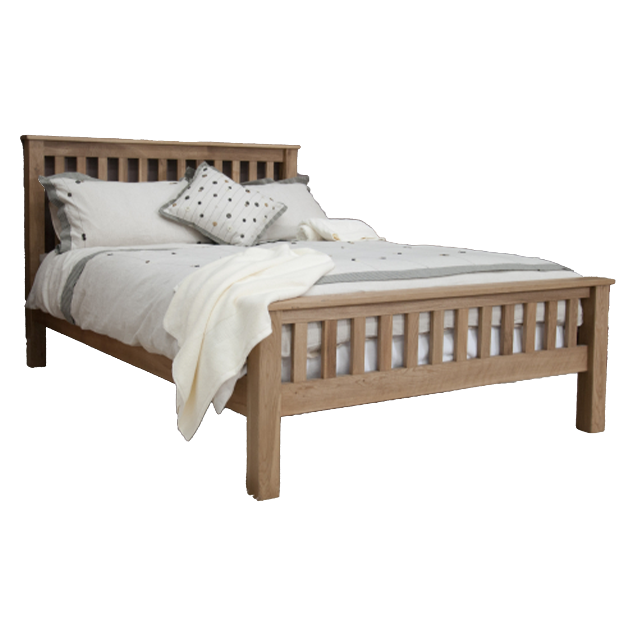 The Opus Bed - High foot end combines timeless elegance with sturdy craftsmanship, creating a focal point for any bedroom. Made from high-quality oak, this bed exudes durability and sophistication. The sleek design with a high foot end adds a touch of refinement to your sleeping space. The Opus Bed features sprung slats for added comfort and support, ensuring a restful night's sleep. Finished with a clear lacquer, this bed is not only beautiful but also easy to maintain.