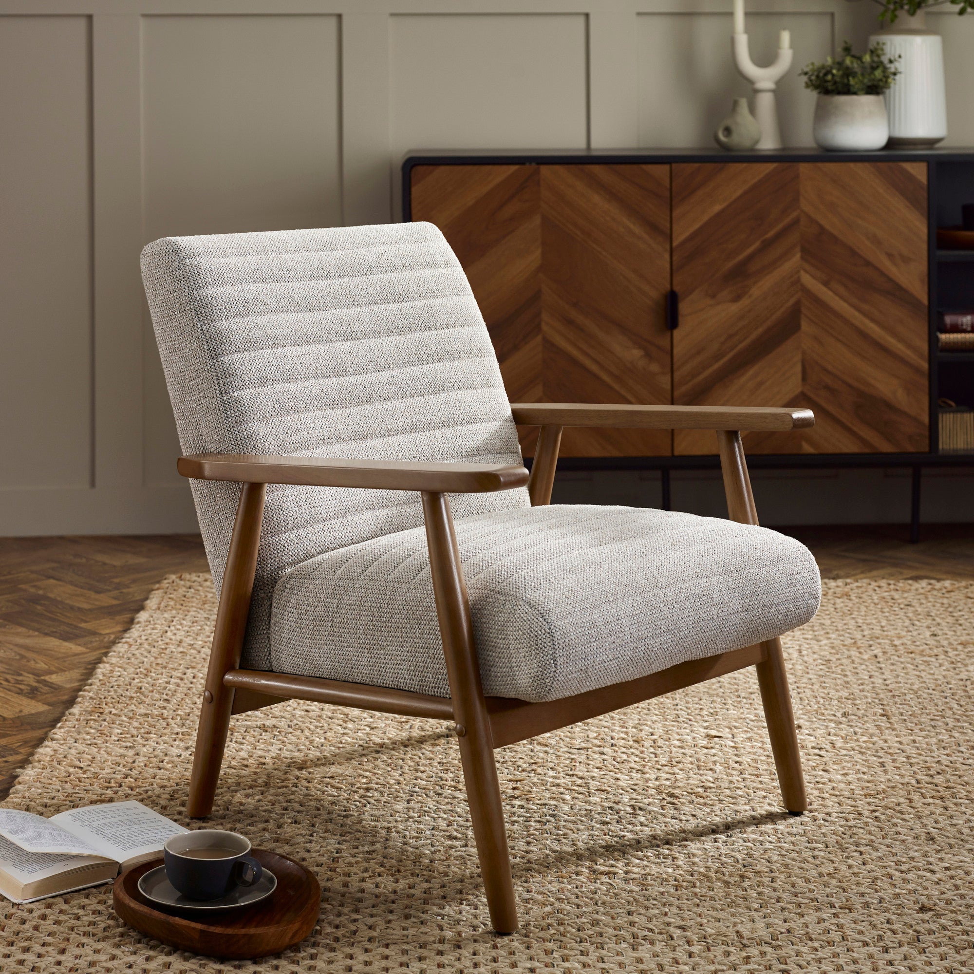 Unwind in comfort with this elegant armchair, upholstered in soft sand Chenille Tweed. It features ribbed seating and deep cushioning for maximum relaxation, while the dark brown wood-effect frame adds contrast and character. Open armrests and angled legs showcase timeless mid-century style, making it perfect for a reading nook or living room. Partial assembly required; simply attach the frame.