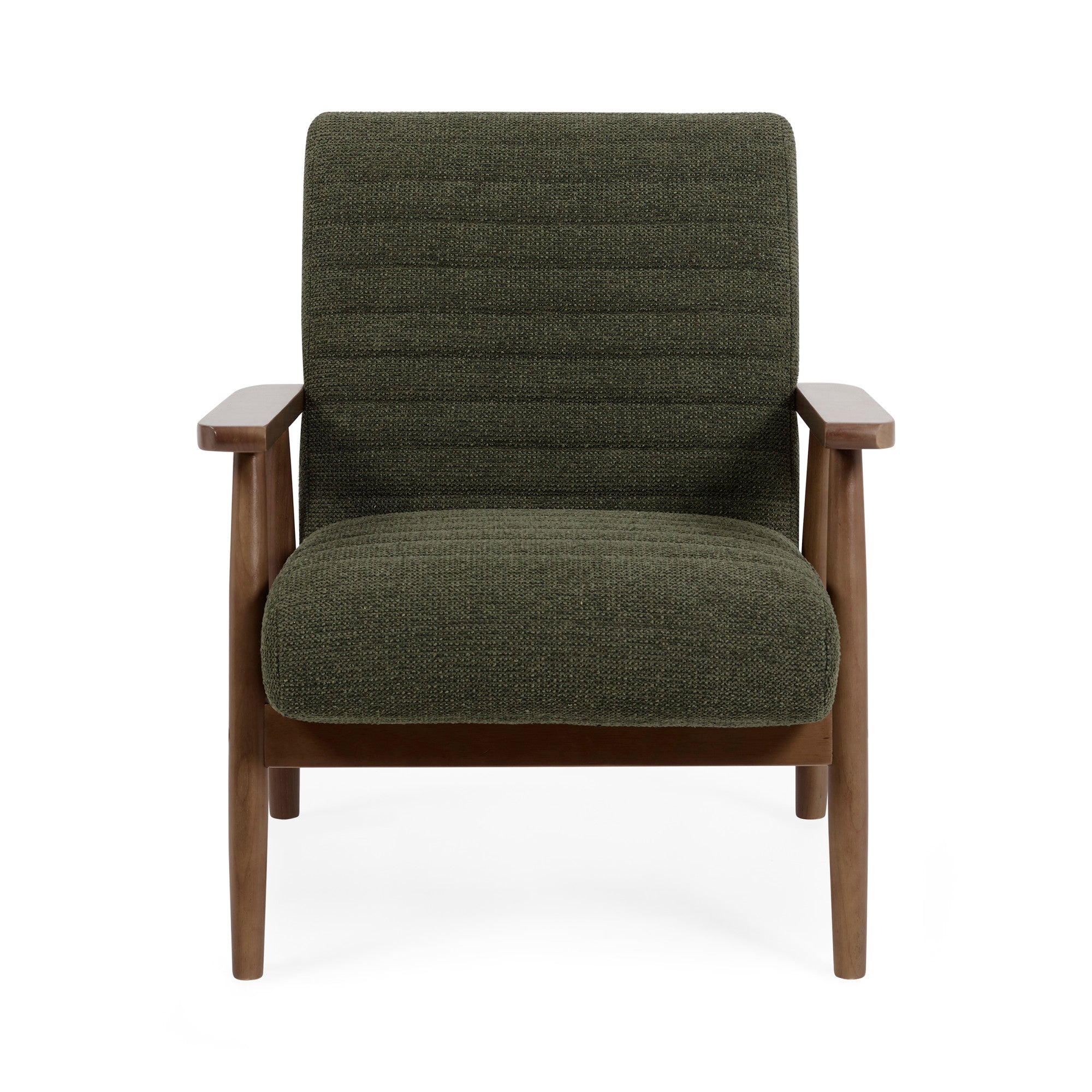 • STYLISH AND STURDY: Dark brown wood-effect frame with angled legs, open armrests, and timeless mid-century design.