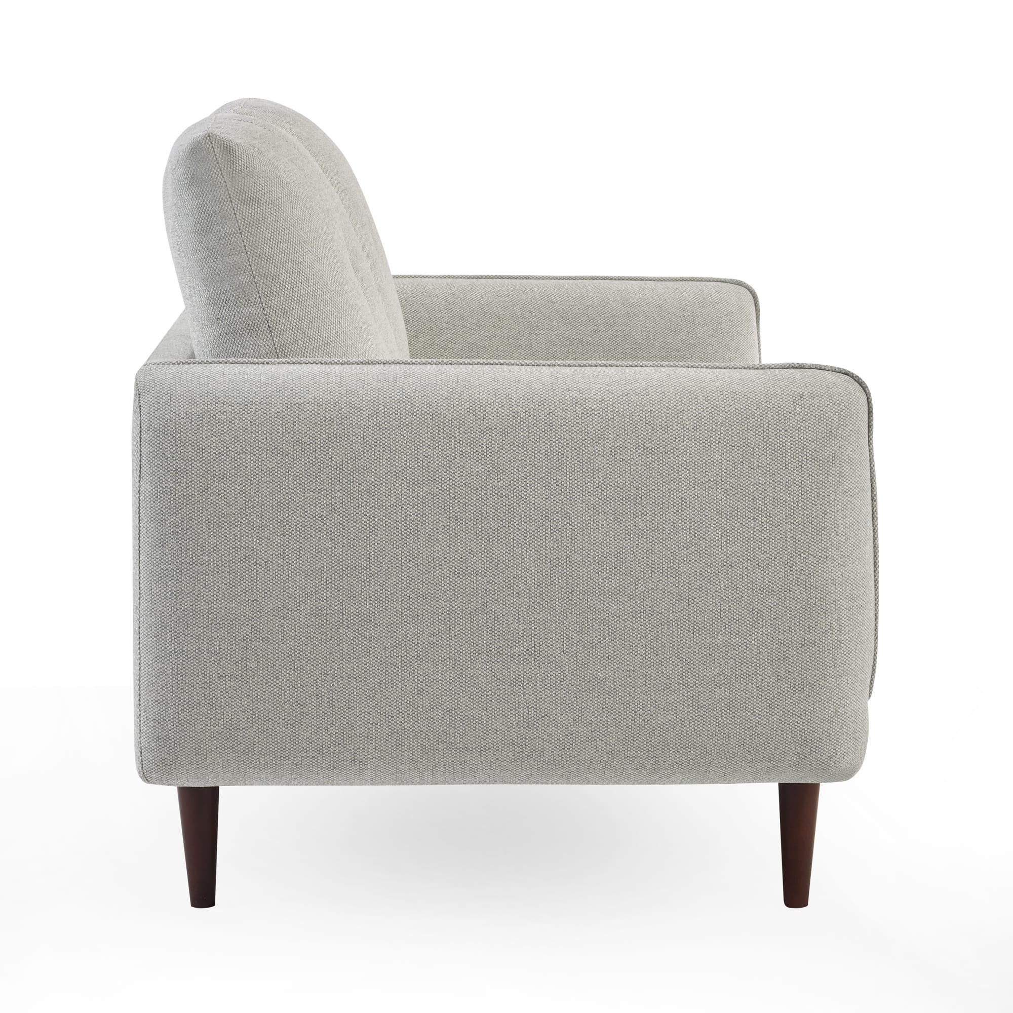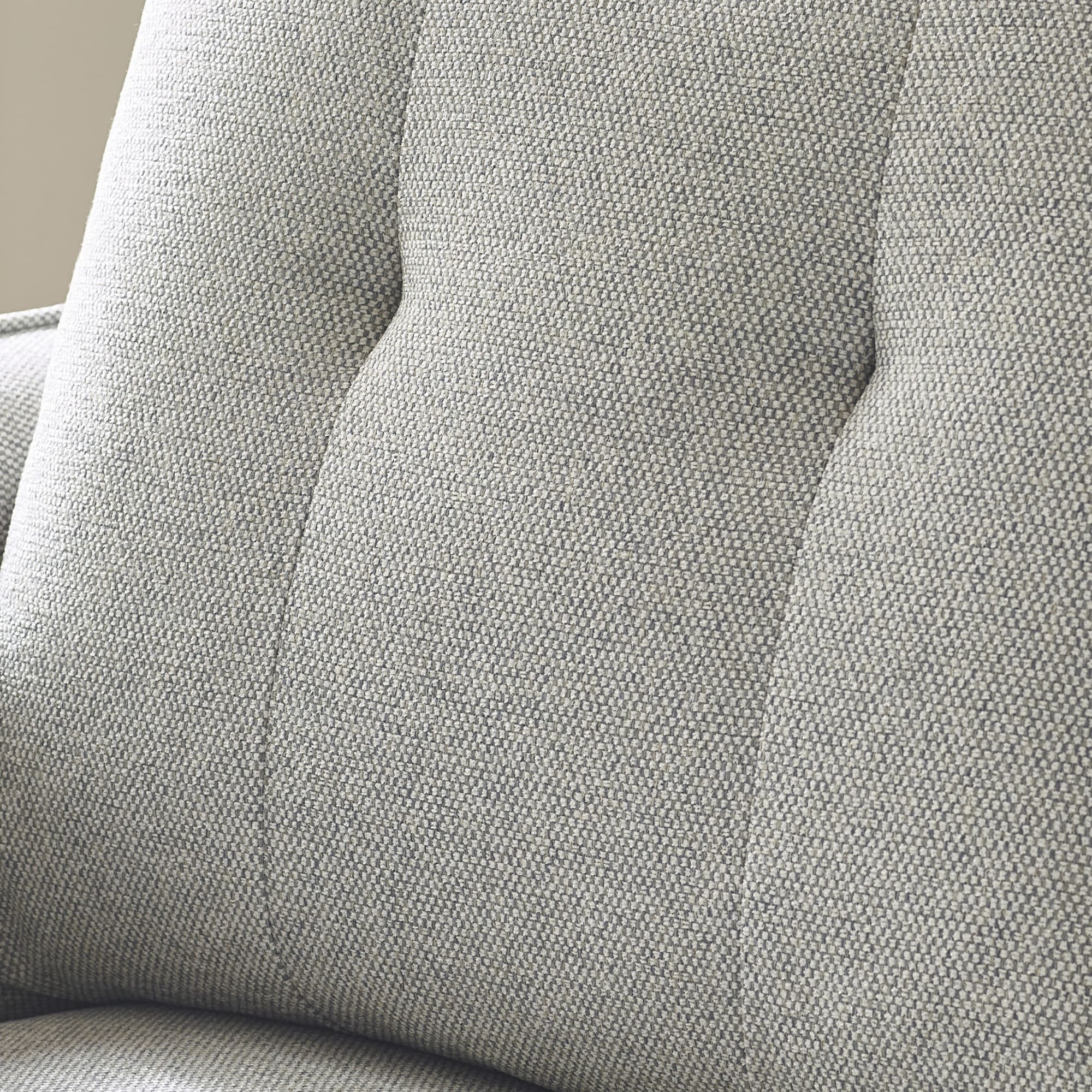 Make a statement with this light grey three-seater sofa, combining modern elegance and mid-century charm. Upholstered in a soft, durable woven fabric, it features tufted back cushions and tapered walnut wooden legs that add vintage flair. Spacious enough for lounging or entertaining, this sofa offers comfortable seating without taking up too much space. Assembly required.