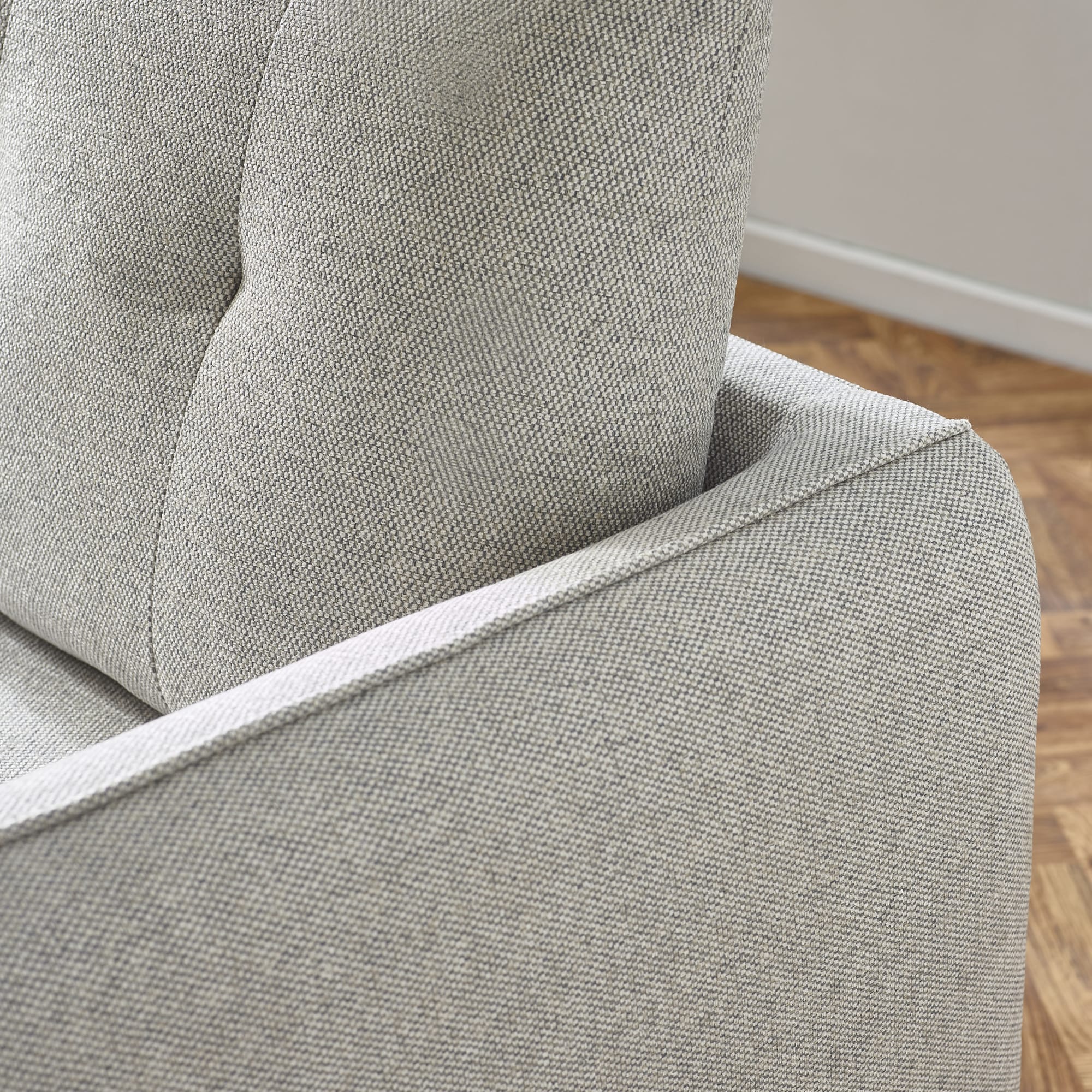 - TEXTURED FABRIC: Upholstered in a soft light grey woven fabric that is both comfortable and durable.