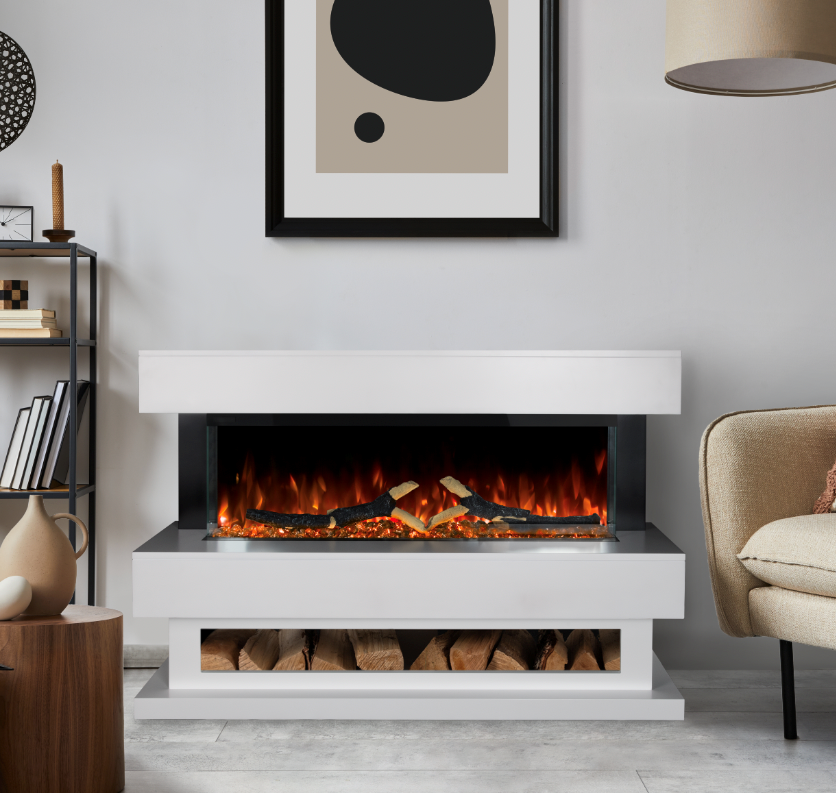 The Ezee Glow 36" Celestial Aura Suite is an all-in-one suite featuring a Celestial fire built into an MDF surround with a modern white and grey finish. It includes a storage unit perfect for decorative logs or everyday items, and offers a 1.4 to 1.6kw heat output with adjustable flame and fuel-bed colours, making it the focal point of any room.