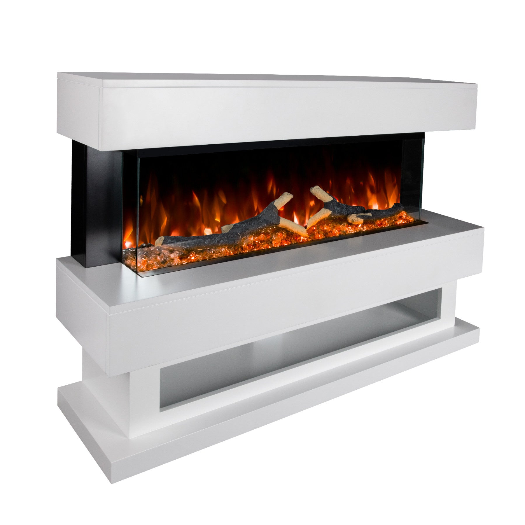 • Fuel bed decoration including glass crystals, artificial logs, and charred wood pieces