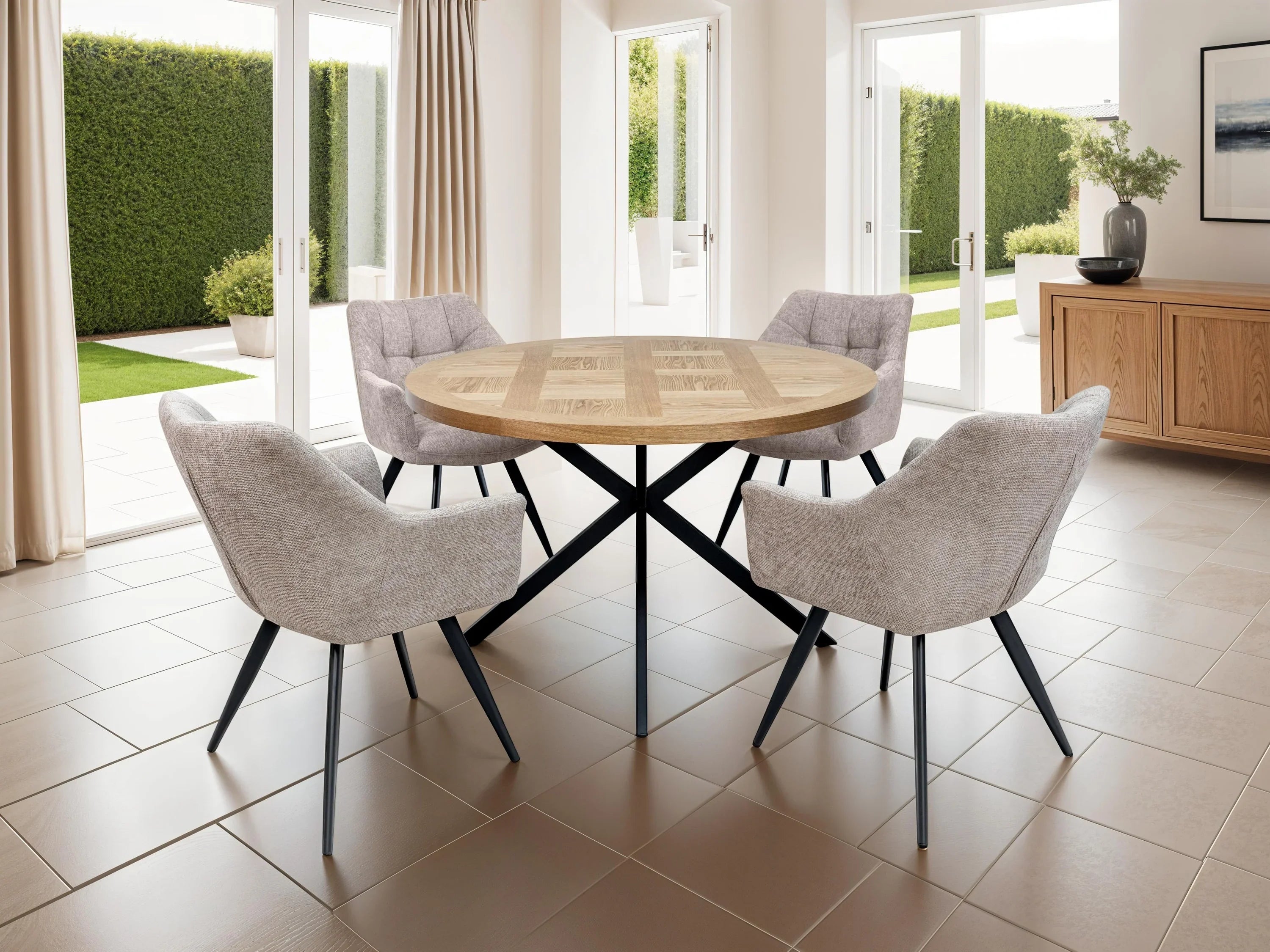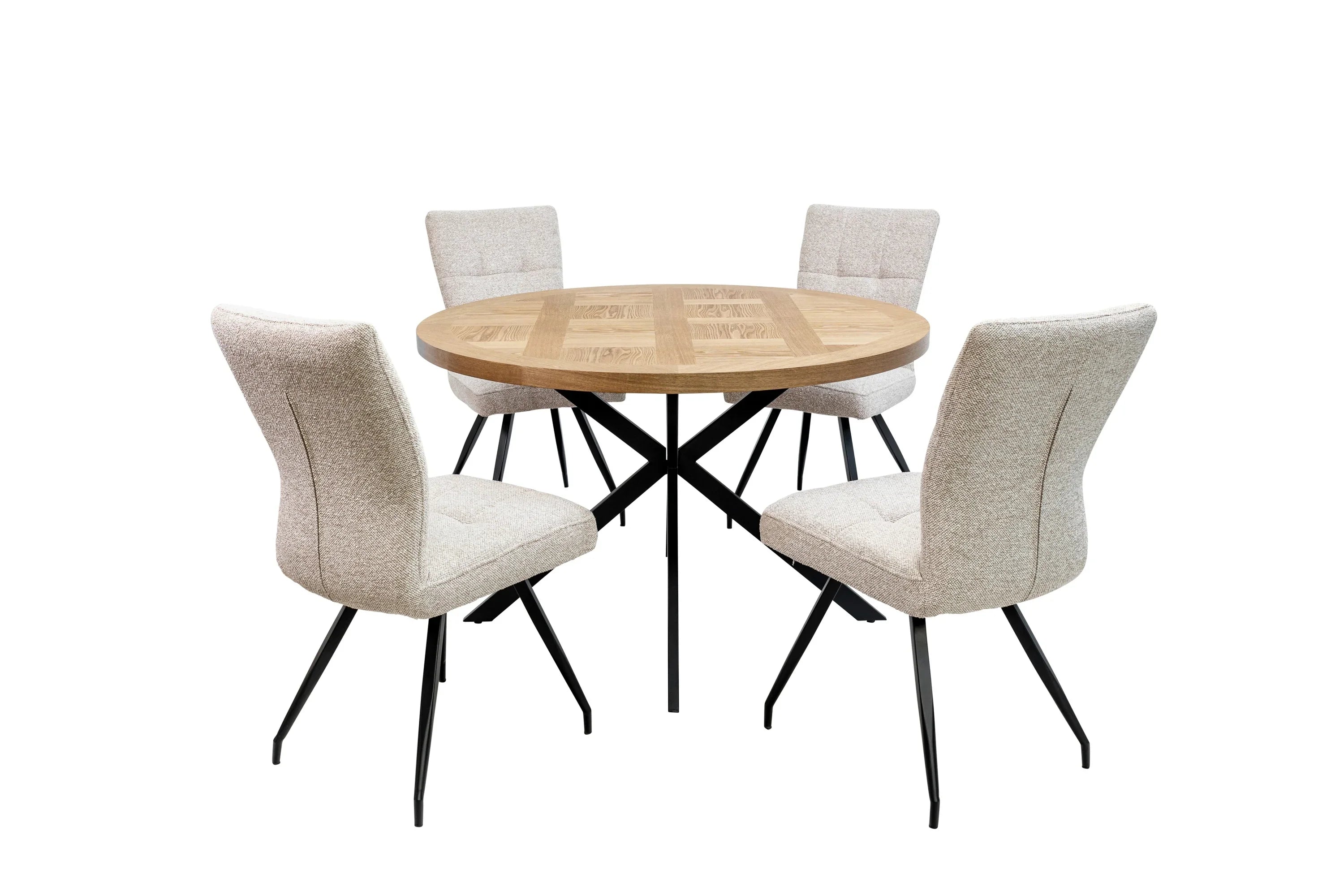 Elevate your dining experience with this exquisite dining table, showcasing a stunning hand-designed parquet inlay that adds a touch of elegance to any home. The warm medium oak finish not only enhances its visual appeal but also brings a sense of character and warmth to your dining area, making it the perfect centrepiece for family gatherings and entertaining guests.