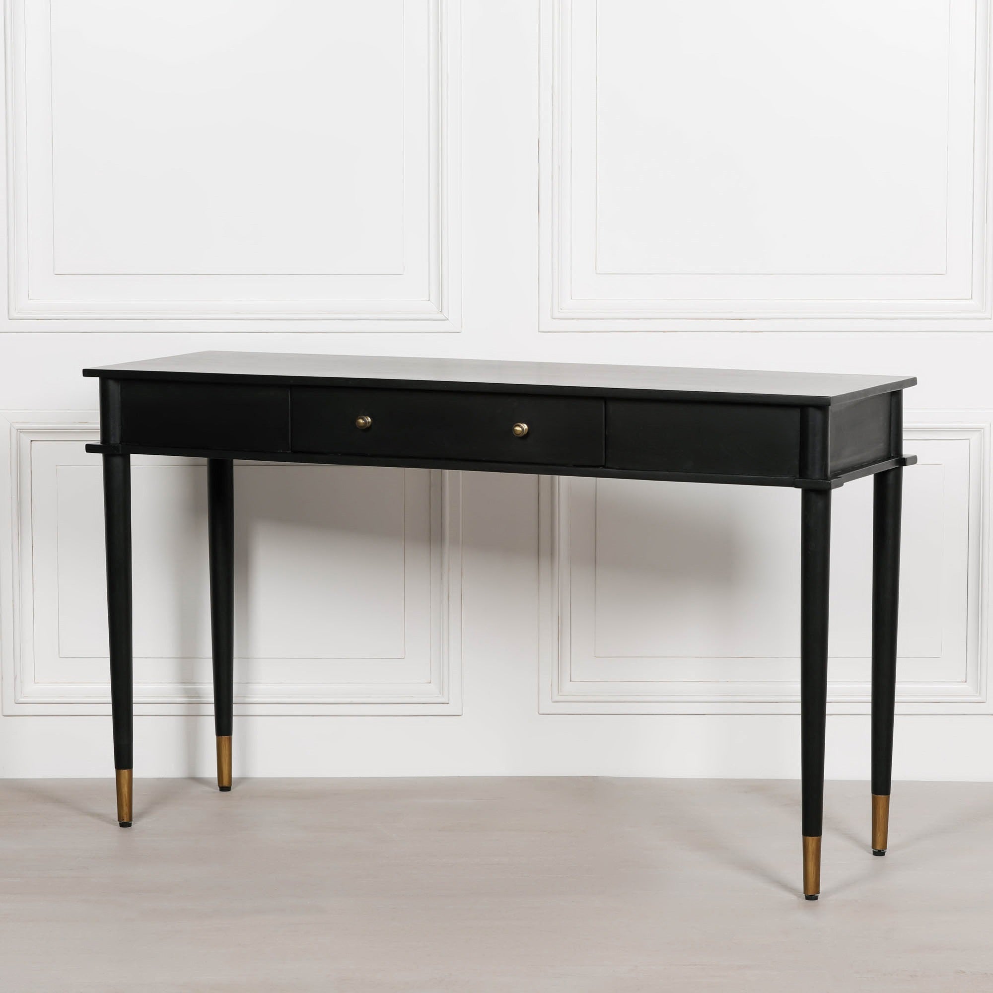 This hand-crafted console table is made of white cedar with a sleek black painted finish. It features brass detailed handles and feet for a touch of elegance.
