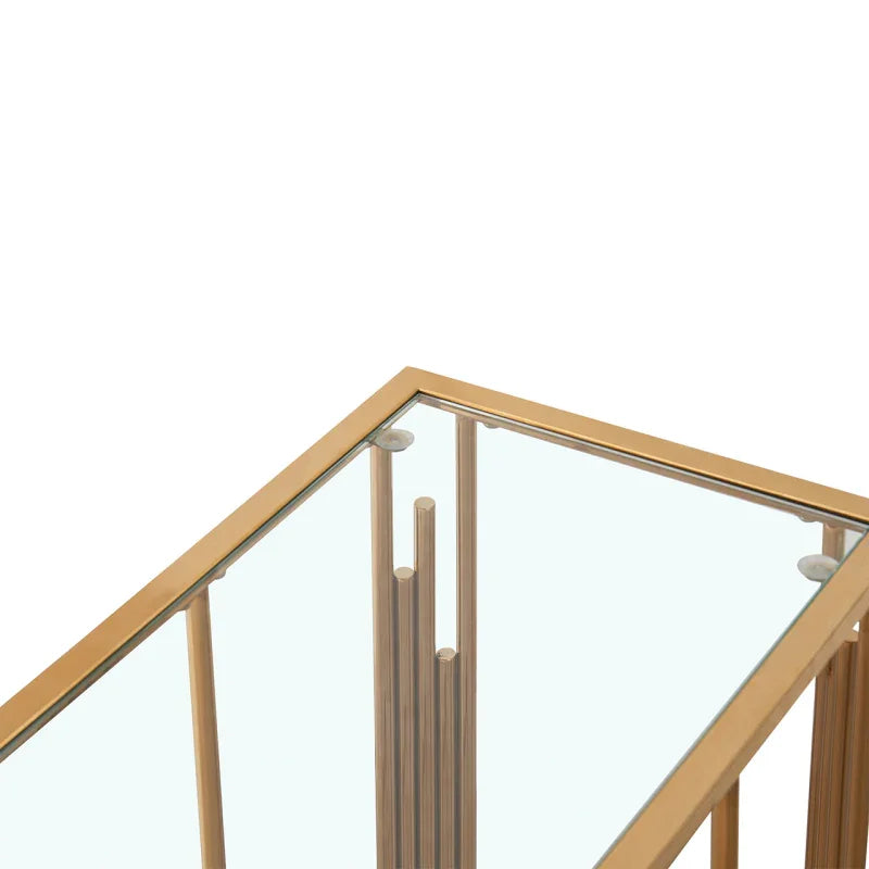Elevate your living space with the Cohen Gold Sofa Table, a stunning blend of luxury and sophistication. Its sleek design and radiant gold finish make it an ideal accent piece for any room, offering a perfect spot for decorative items or essential belongings. Whether styled in a contemporary setting or a classic interior, this table effortlessly enhances the aesthetic of your home.