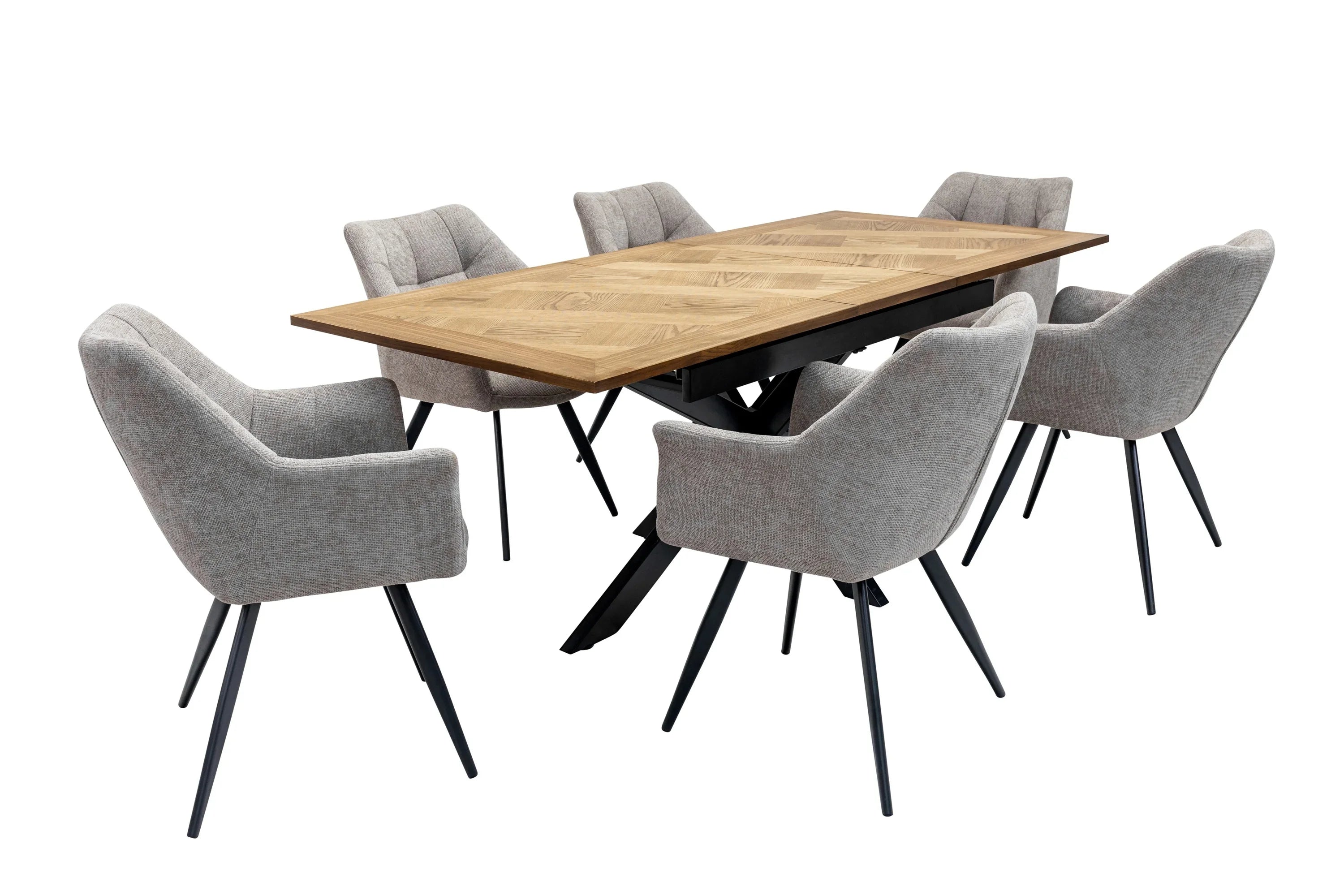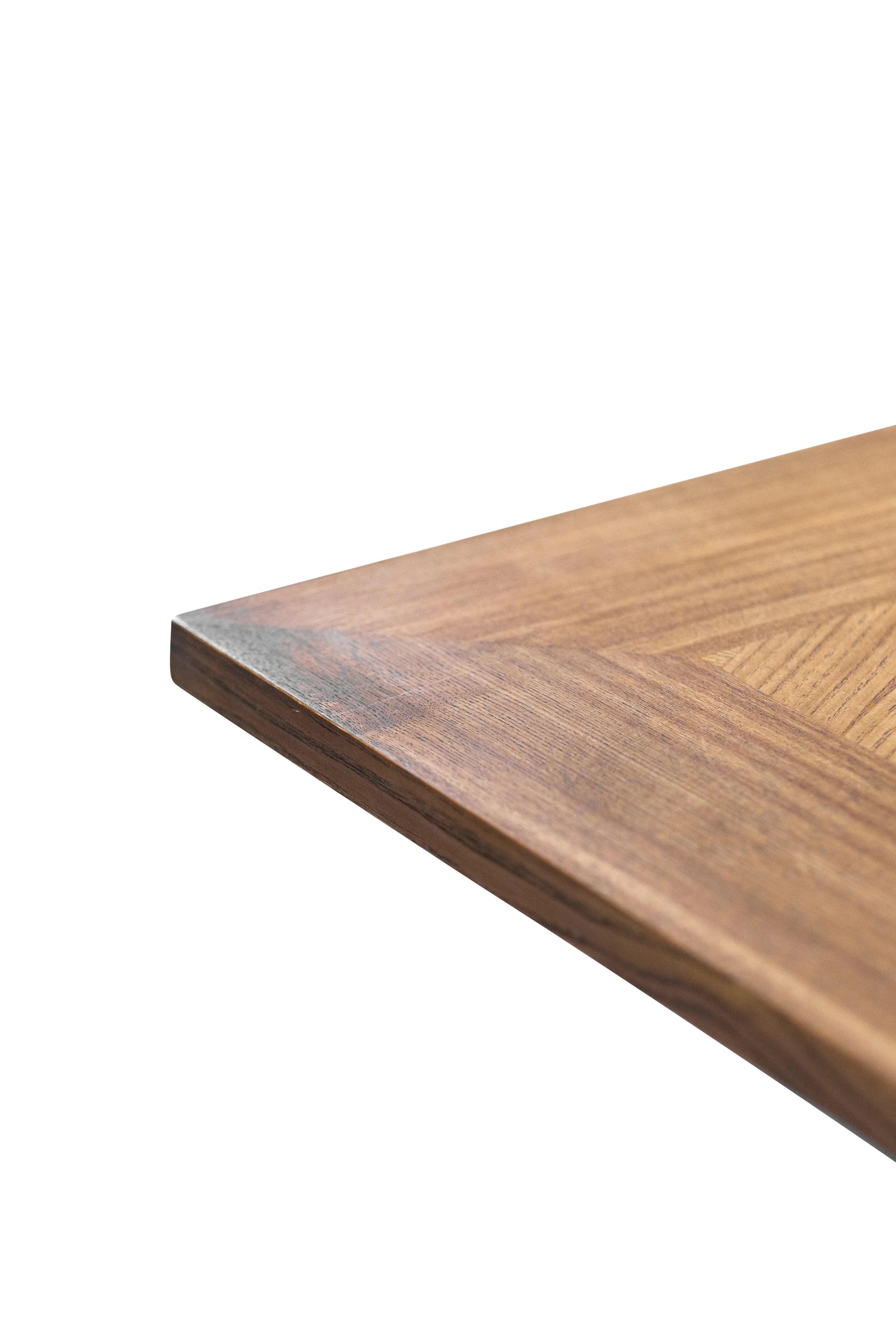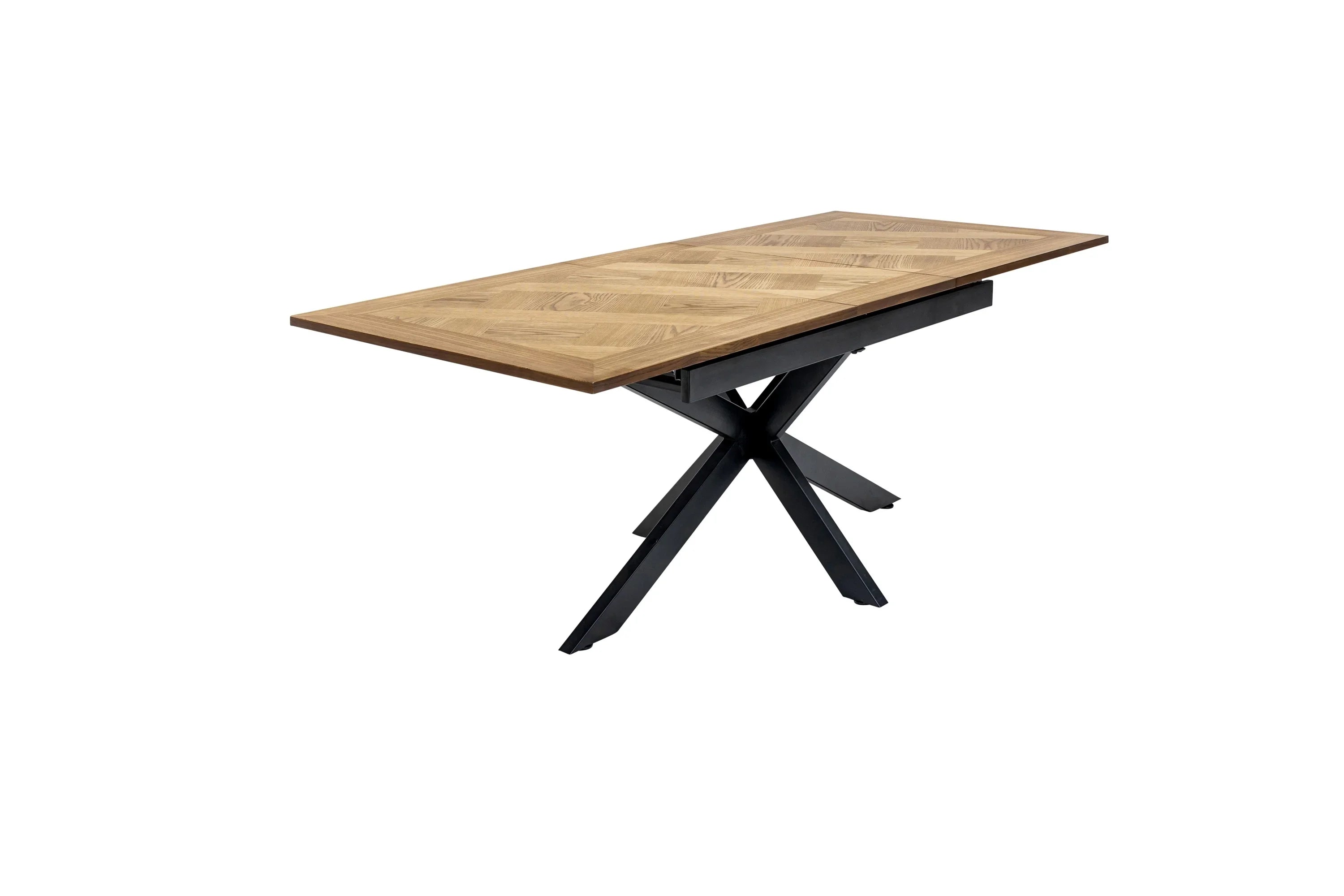 Crafted from high-quality MDF and adorned with real oak veneers, this table boasts a beautifully designed parquet finish that highlights exceptional craftsmanship. The striking black powder-coated steel x-frame base provides both stability and a modern touch, ensuring this table will last for years to come.