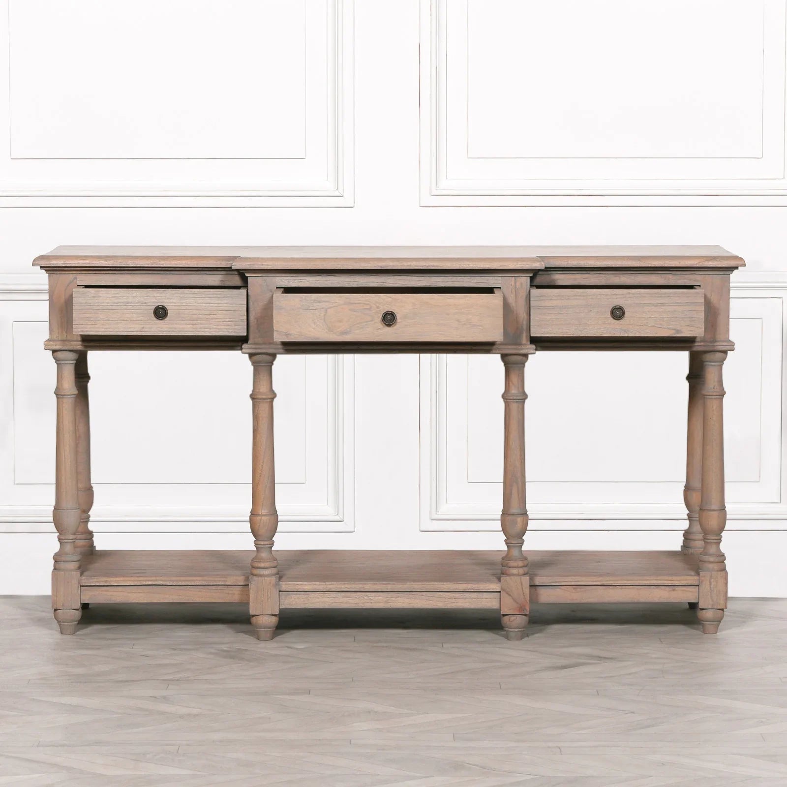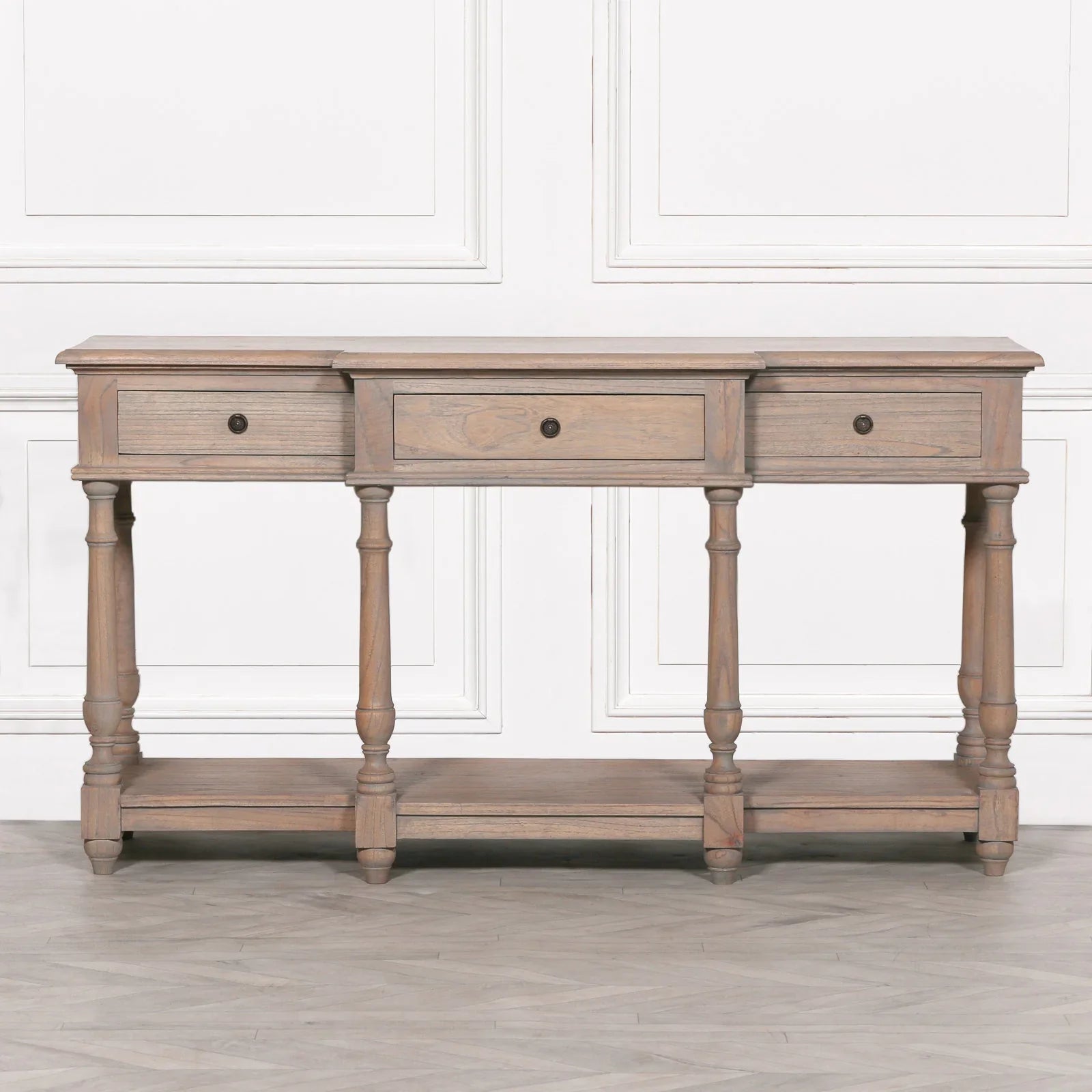 Add a touch of rustic charm to your living space with this White Cedar Breakfront Console. Featuring a unique breakfront design, six columned legs, and three spacious drawers, this console is both stylish and functional.