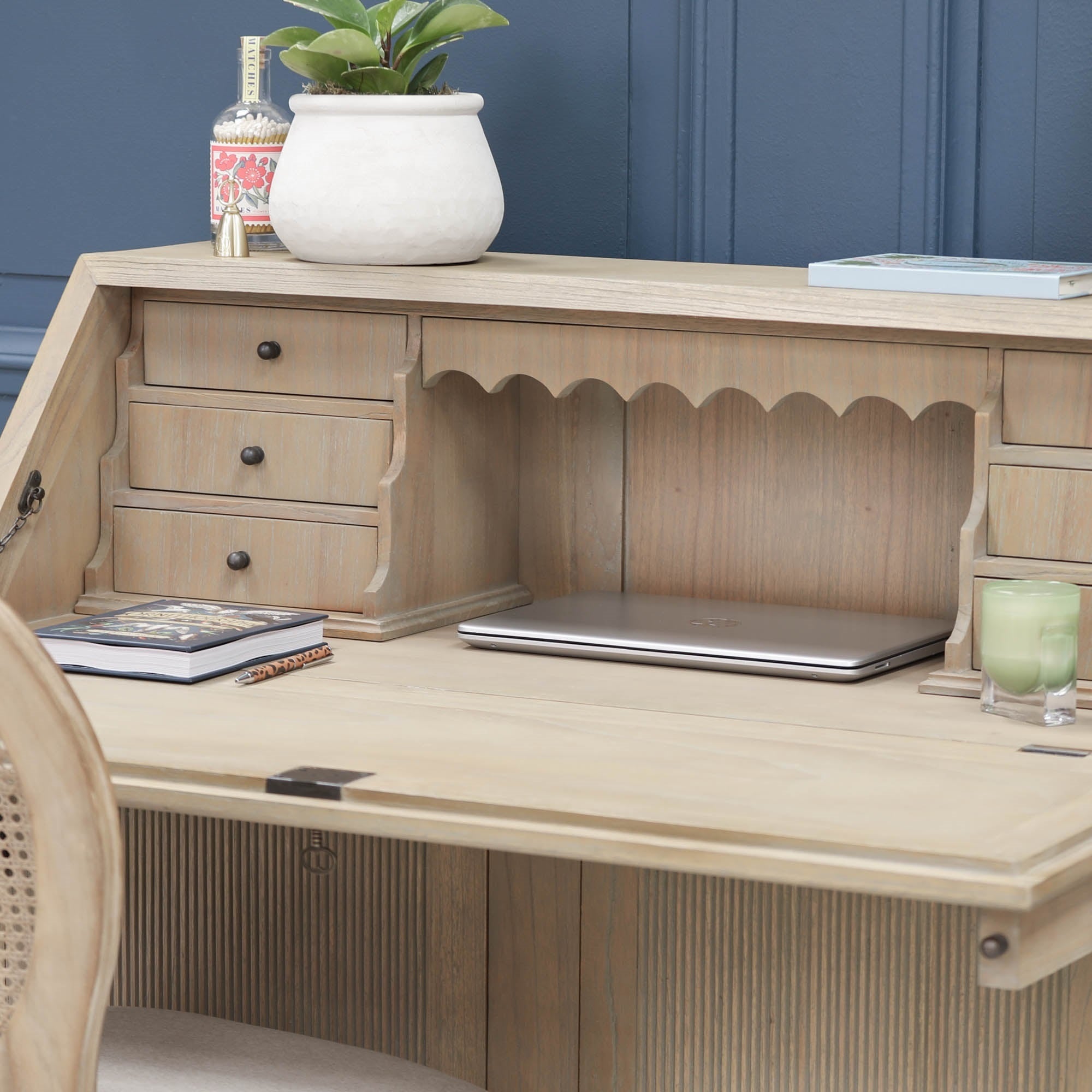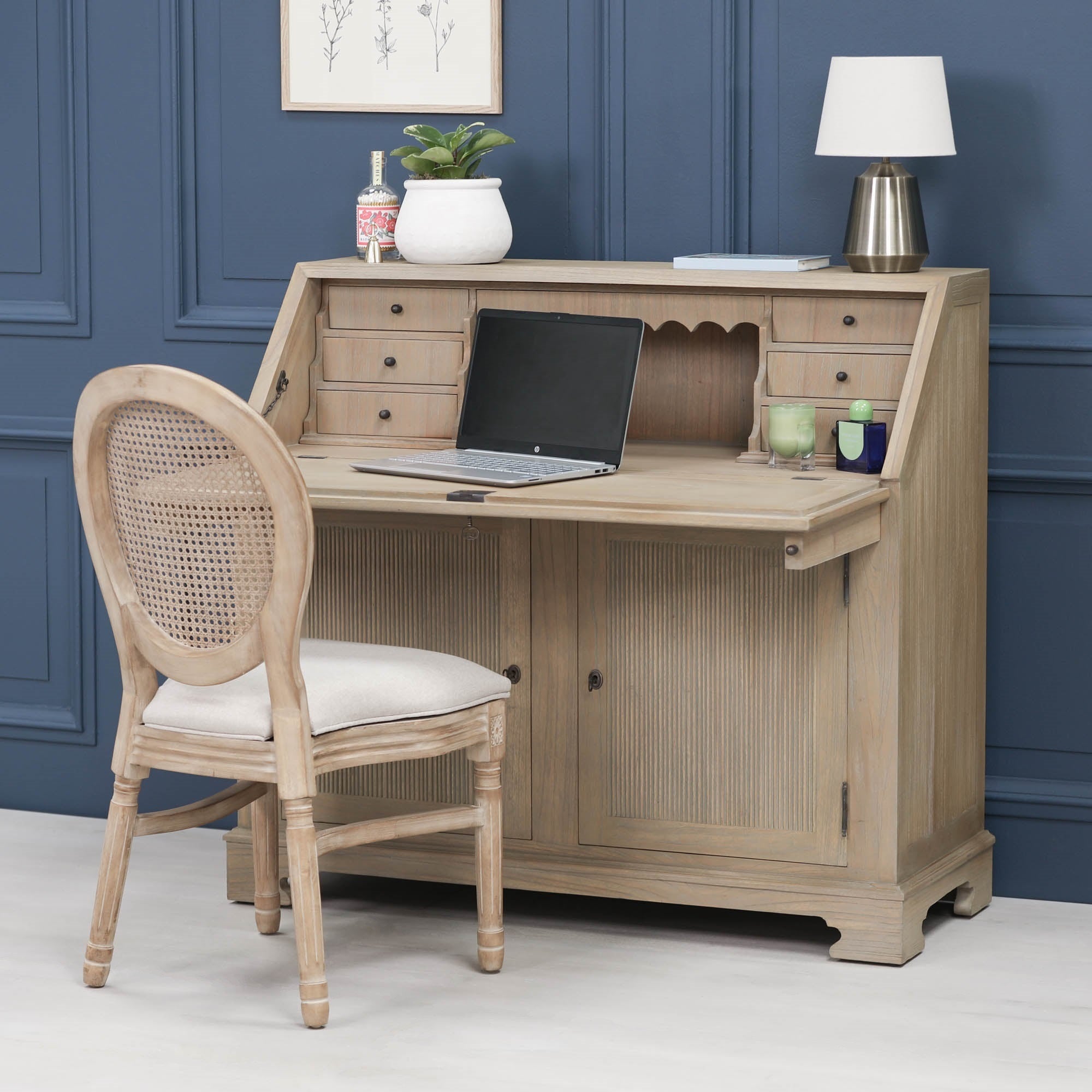 Enhance your home office with this rustic wooden bureau desk, crafted from white cedar with a charming finish. Perfect for working from home, it boasts 7 drawers, 2 storage cupboards with shelves, and lockable compartments. Pair it with the Wooden Louis Upholstered Chair for a complete look.
