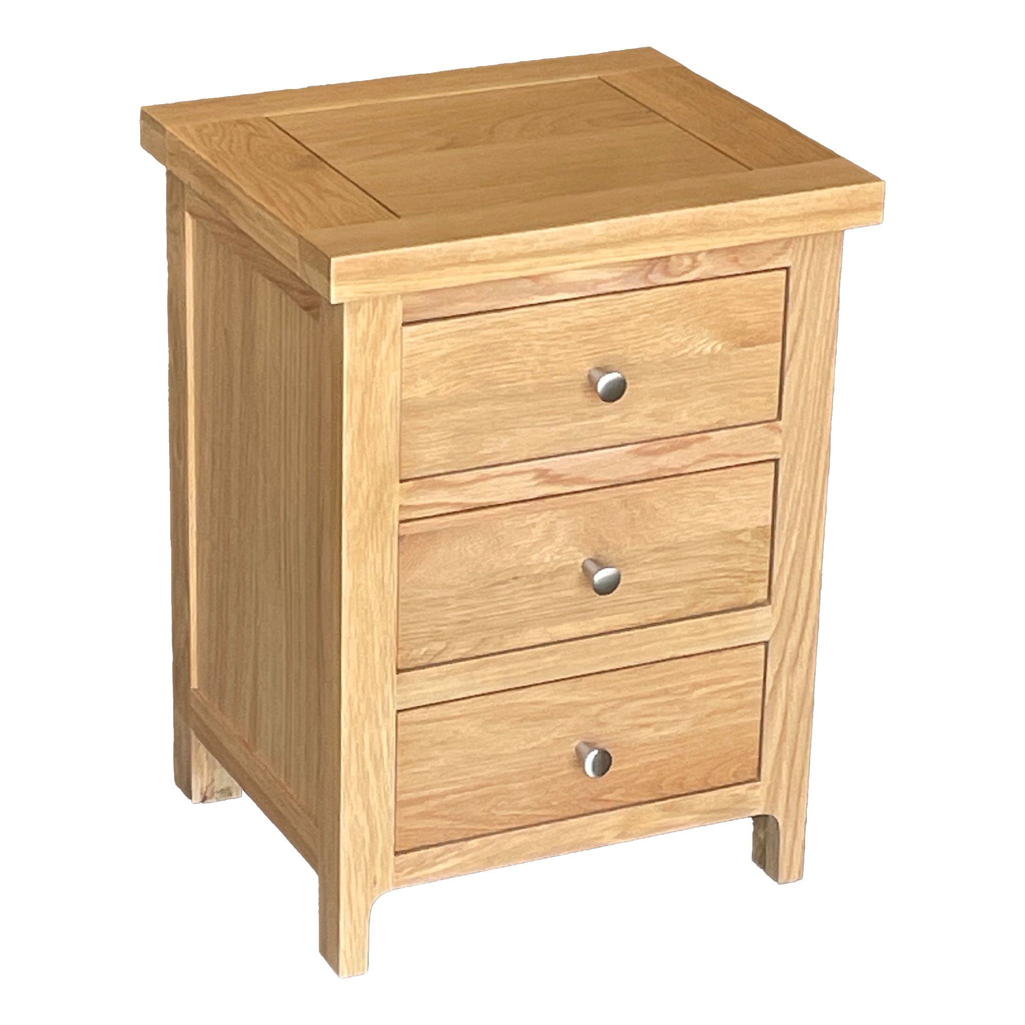 The Como 3 Drawer Bedside Cabinet is a stunning addition to your bedroom, featuring elegant arched legs and three spacious drawers meticulously crafted with dovetailed front and rear drawer boxes on smooth wooden runners. The cabinet is adorned with nickel-plated knobs for a touch of sophistication. Constructed using solid American Oak frames, Paulownia drawer boxes, and Oak Veneer centre panels, this piece is not only visually appealing but also durable. The clear lacquer finish enhances the natural beauty of the wood, adding a touch of timeless elegance to your room.