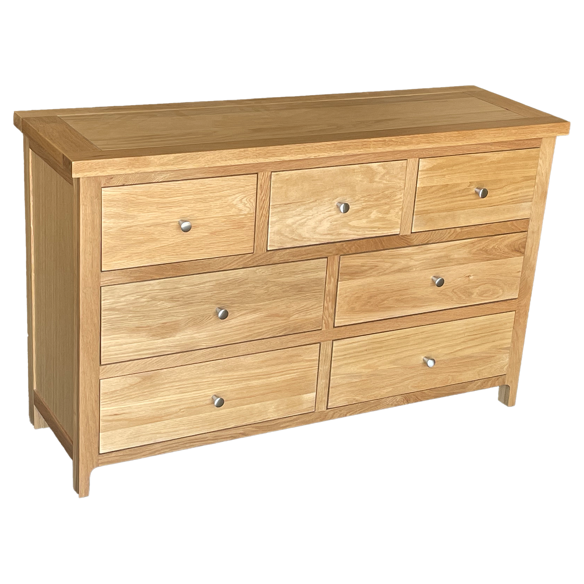 The Como 7 Drawer Chest is a standout piece that combines style with functionality. Crafted with solid American Oak frames, Paulownia drawer boxes, and Oak Veneer centre panels, this chest exudes quality craftsmanship. Its elegant arched legs add a touch of sophistication to any room, ma it a versatile addition to your home.