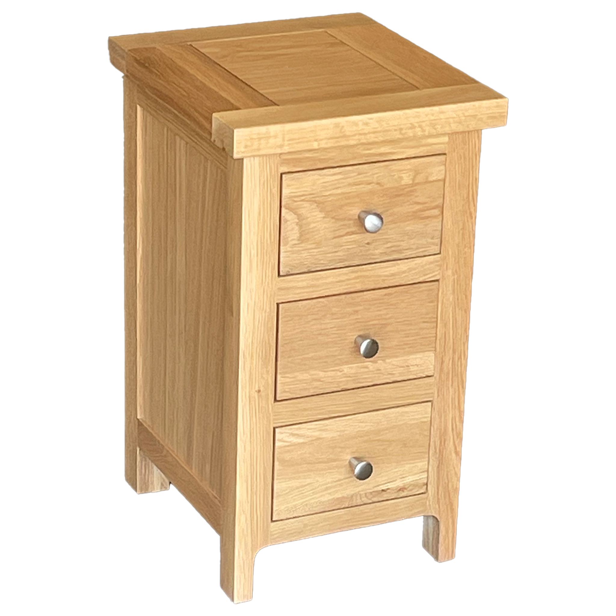 The Como Narrow Bedside Cabinet offers a stylish and practical solution for your bedroom needs. This compact version of the classic 3 Drawer Bedside exudes elegance with its arched legs and dovetailed drawer boxes on wooden runners. Crafted with solid American Oak frames, Paulownia drawer boxes, and Oak Veneer centre panels, this bedside cabinet is not only visually appealing but also durable and long-lasting. The Nickel-plated knobs add a touch of sophistication to the design, enhancing its overall charm. The clear lacquer finish provides a protective layer, ensuring the beauty of the cabinet endures.