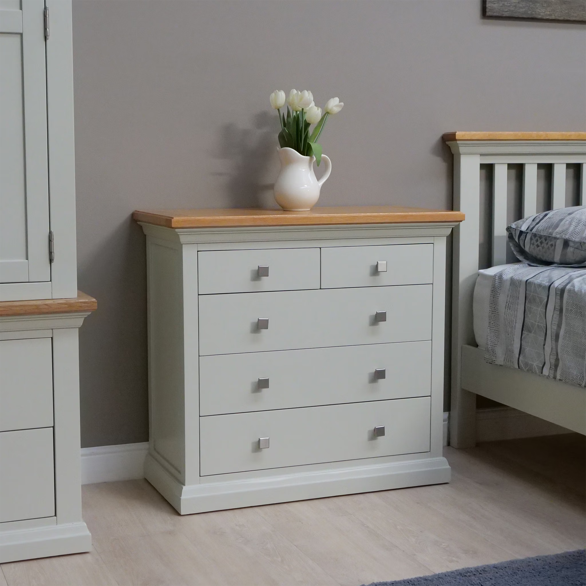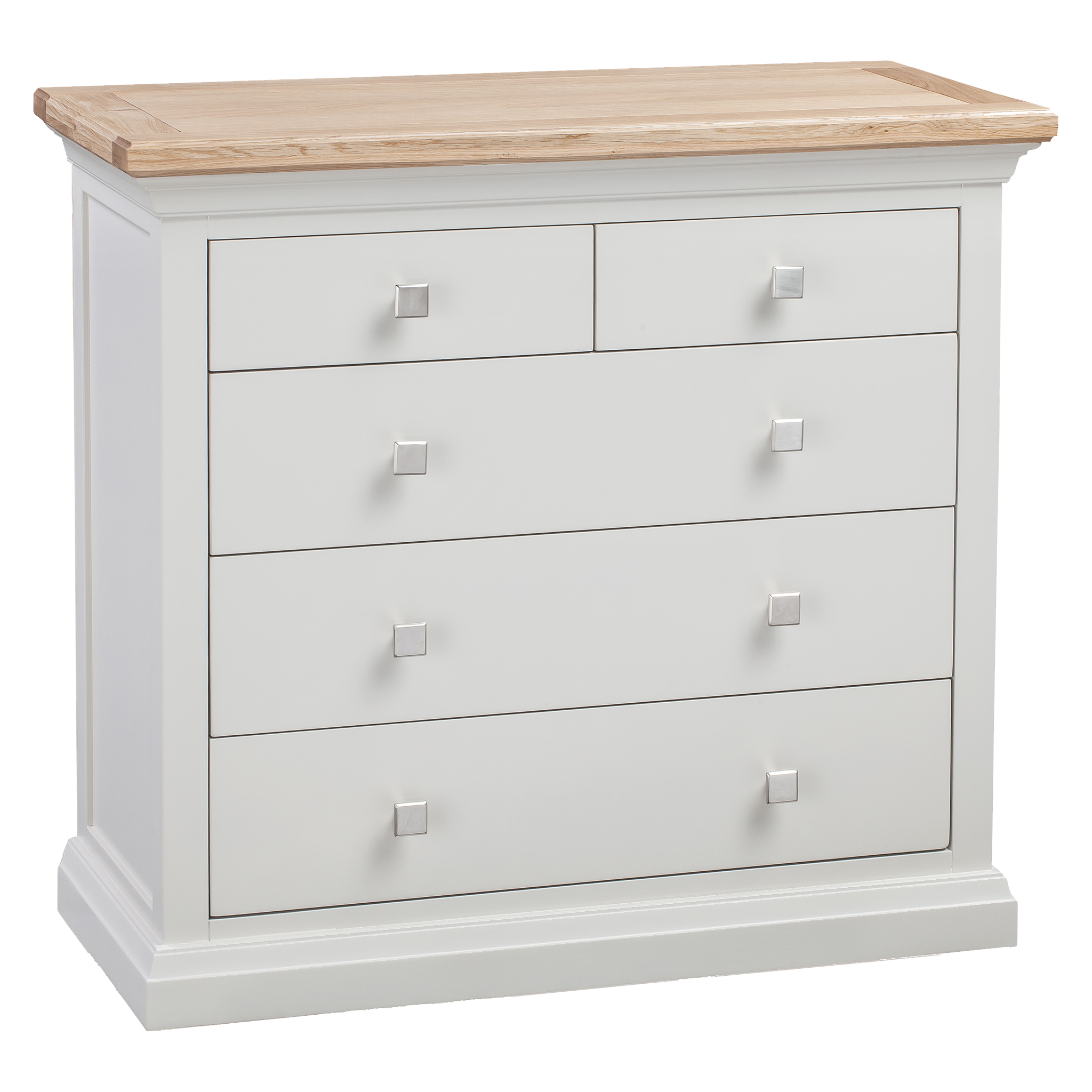 The Cotswold 3+2 Chest is a charming addition to any bedroom, offering ample storage space with its two shallow drawers over three deeper drawers design. Crafted from painted pine with an oak top finished in a clear lacquer, this chest of drawers exudes quality craftsmanship and timeless elegance.