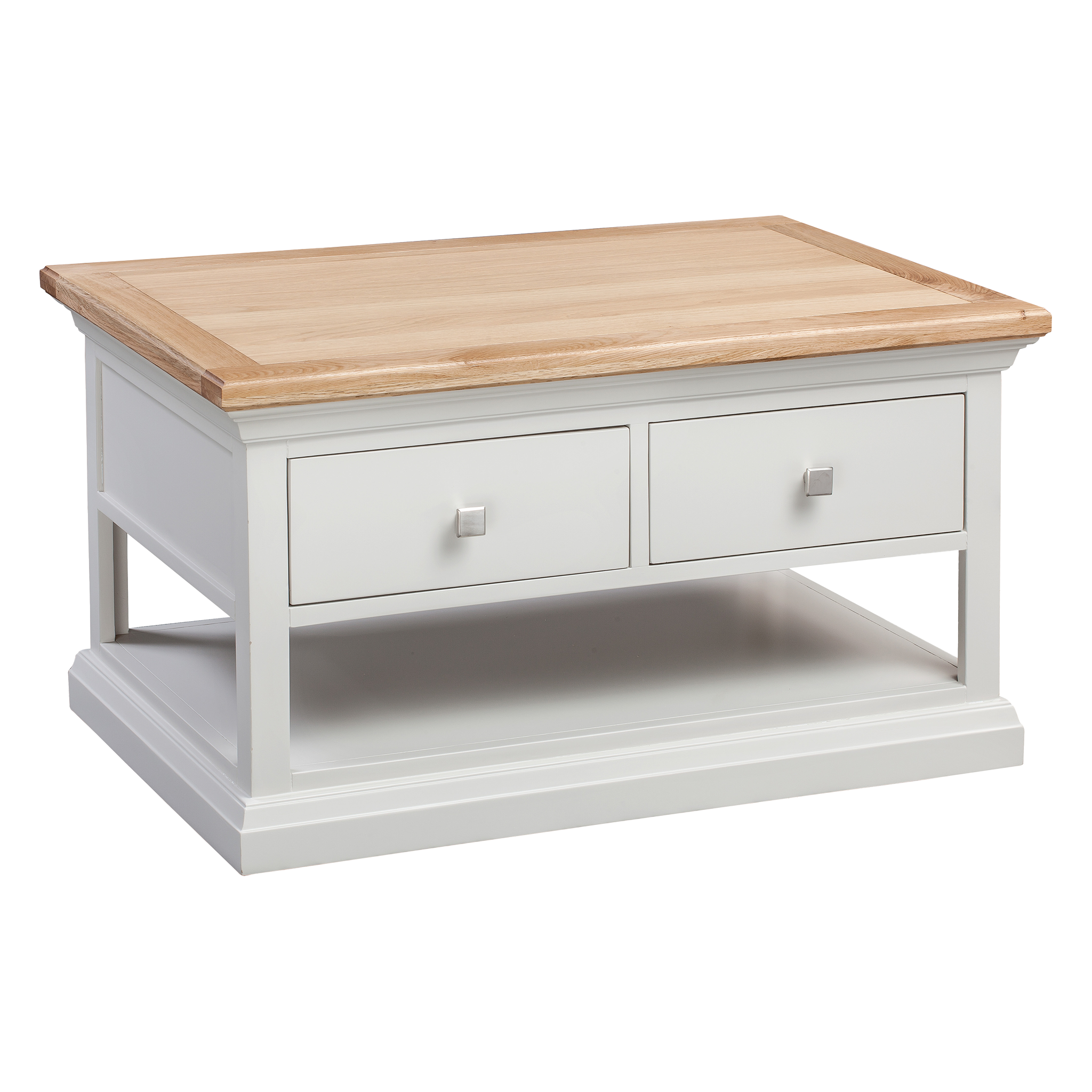 The Cotswold Coffee Table brings a touch of timeless elegance to your living space. Crafted with a blend of painted pine and a lacquered oak top, this coffee table exudes artisanal charm. Its thoughtful design incorporates two spacious drawers and a lower shelf, offering both style and functionality in one exquisite piece.