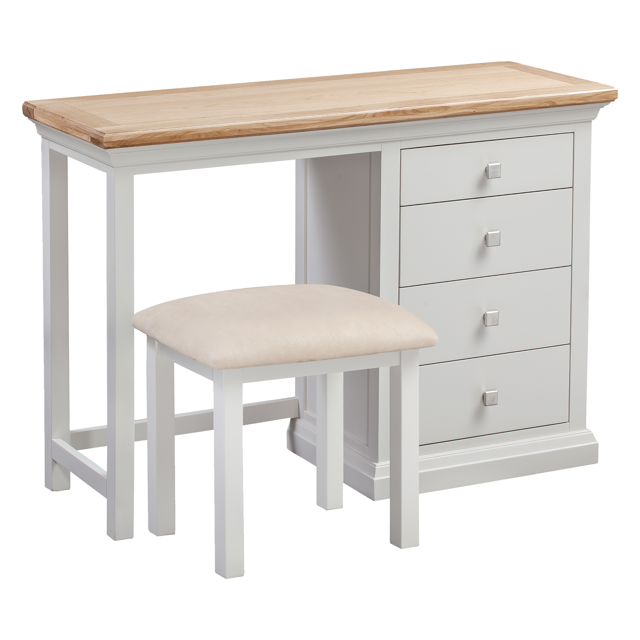 Enhance your bedroom with the timeless elegance of our Cotswold Dressing Table & Stool set. Crafted from painted pine with a stunning oak top finished in a clear lacquer, this dressing table features four spacious drawers to keep all your essentials organised. With one shallower drawer and three deeper ones, you'll have plenty of storage space for your beauty products, accessories, and more. The set comes complete with a padded dressing table stool for added comfort and convenience.