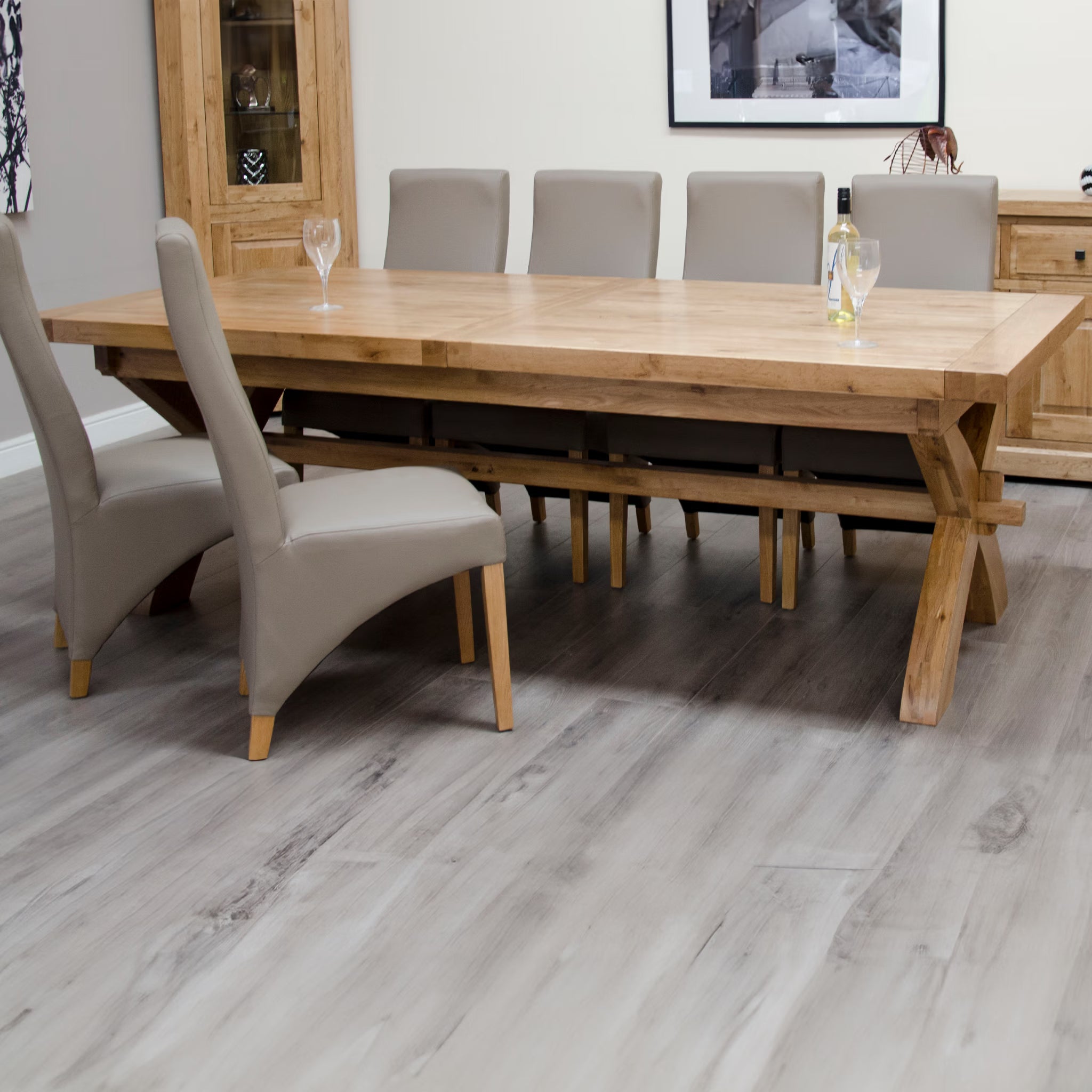 Introducing our Deluxe Super X Leg Extending Table 2400+(2x500), a stunning addition to your dining space from our exclusive Deluxe collection. Crafted with a combination of high-quality oak and solid oak engineered panels, this table exudes elegance and durability. The x-shaped legs add a touch of modern sophistication, while the lacquer finish enhances its beauty.