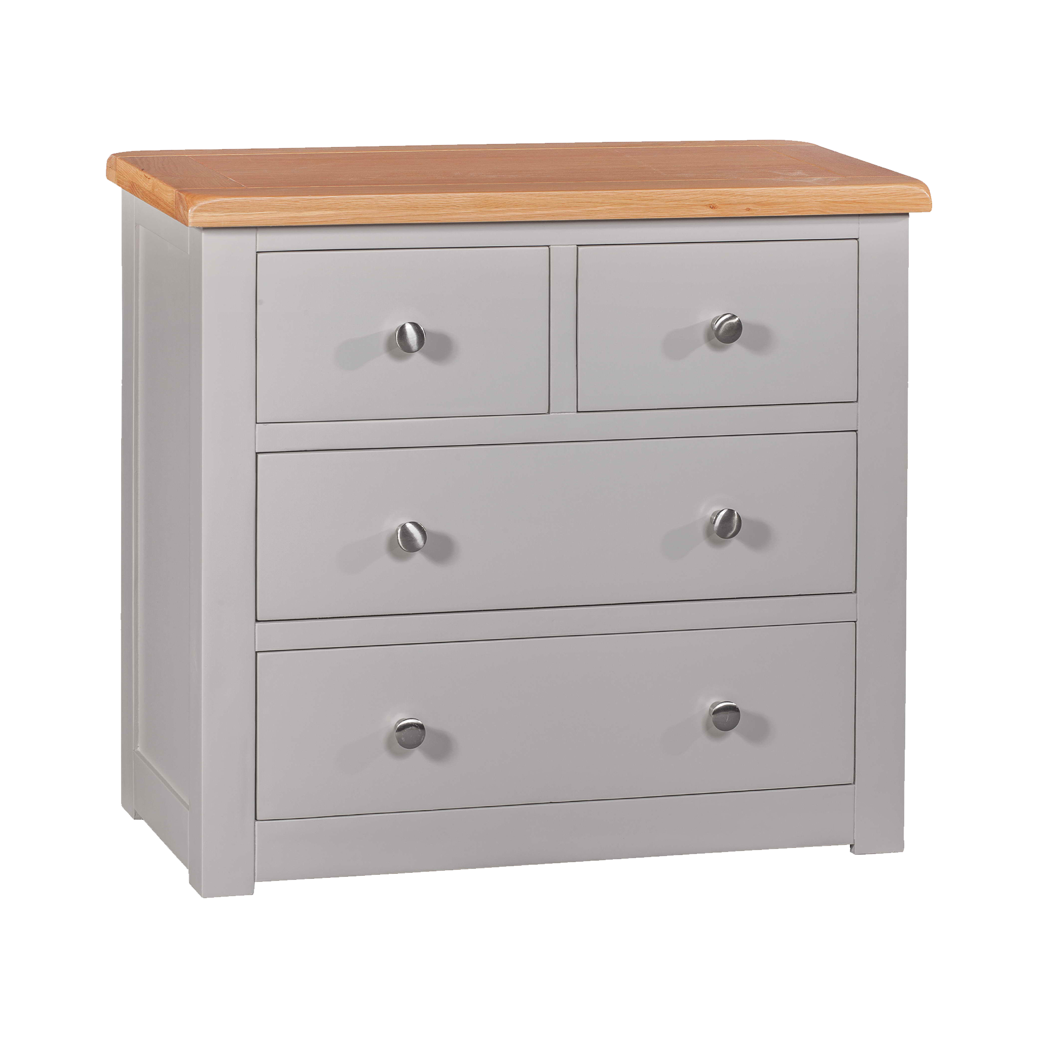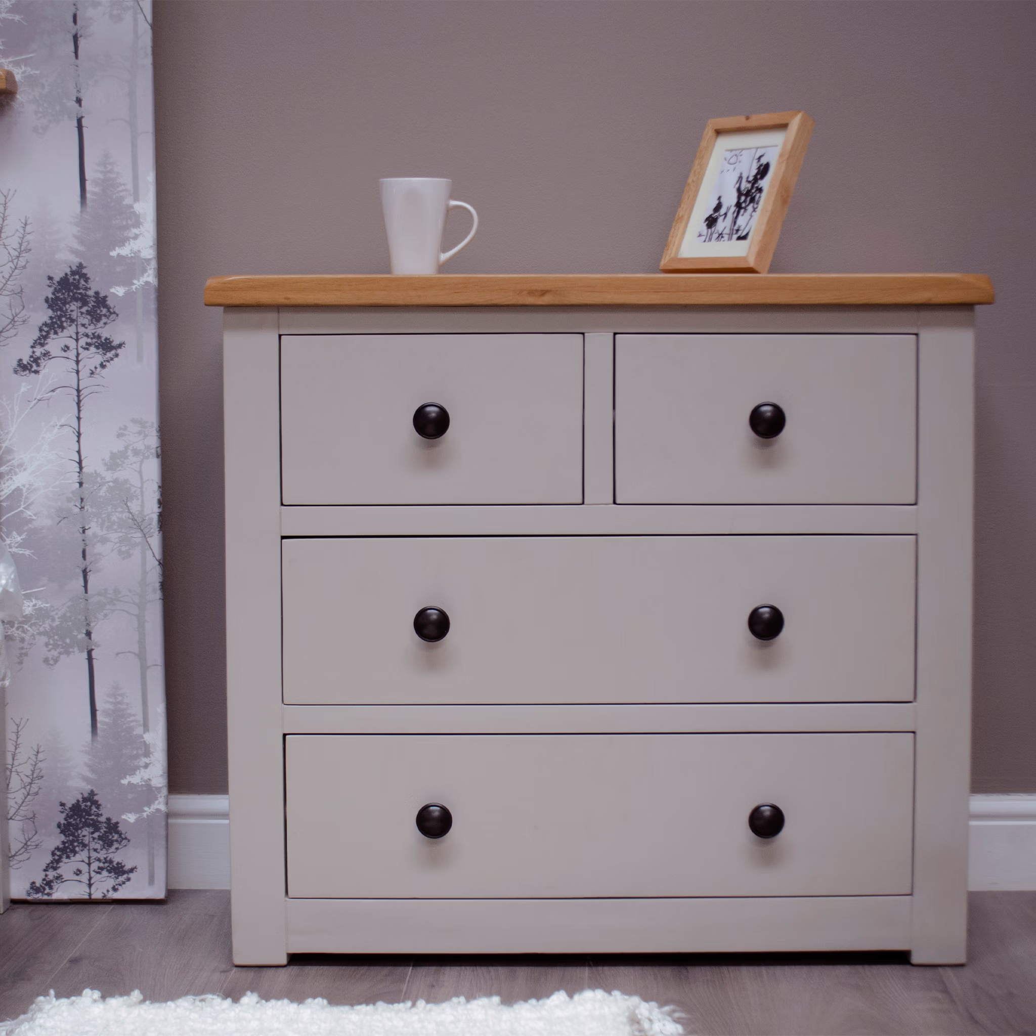We are delighted to introduce the Diamond 2+2 Chest, a stunning addition to any bedroom. This chest of drawers features a practical design with 2 smaller drawers atop 2 larger ones, offering generous storage space for your essentials. Crafted from painted pine with an elegant oak top finished in a clear lacquer, this chest combines style and functionality seamlessly.