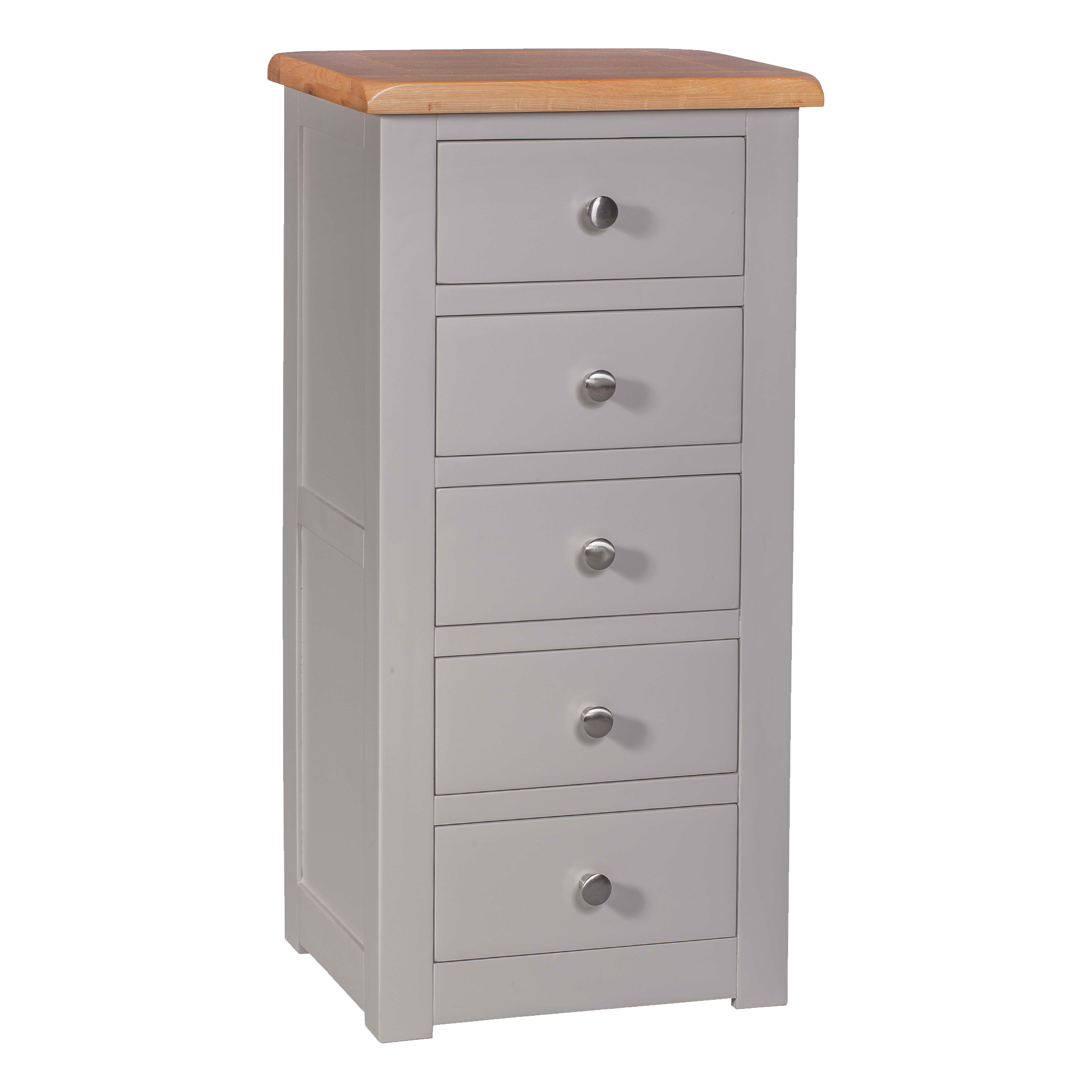 Enhance your bedroom with our Diamond 5 Drawer Tallboy, a stylish and practical storage solution designed to maximise space without compromising on storage capacity. Crafted from sturdy painted pine with a luxurious solid oak top featuring a sleek clear lacquer finish, this tallboy exudes elegance and durability.