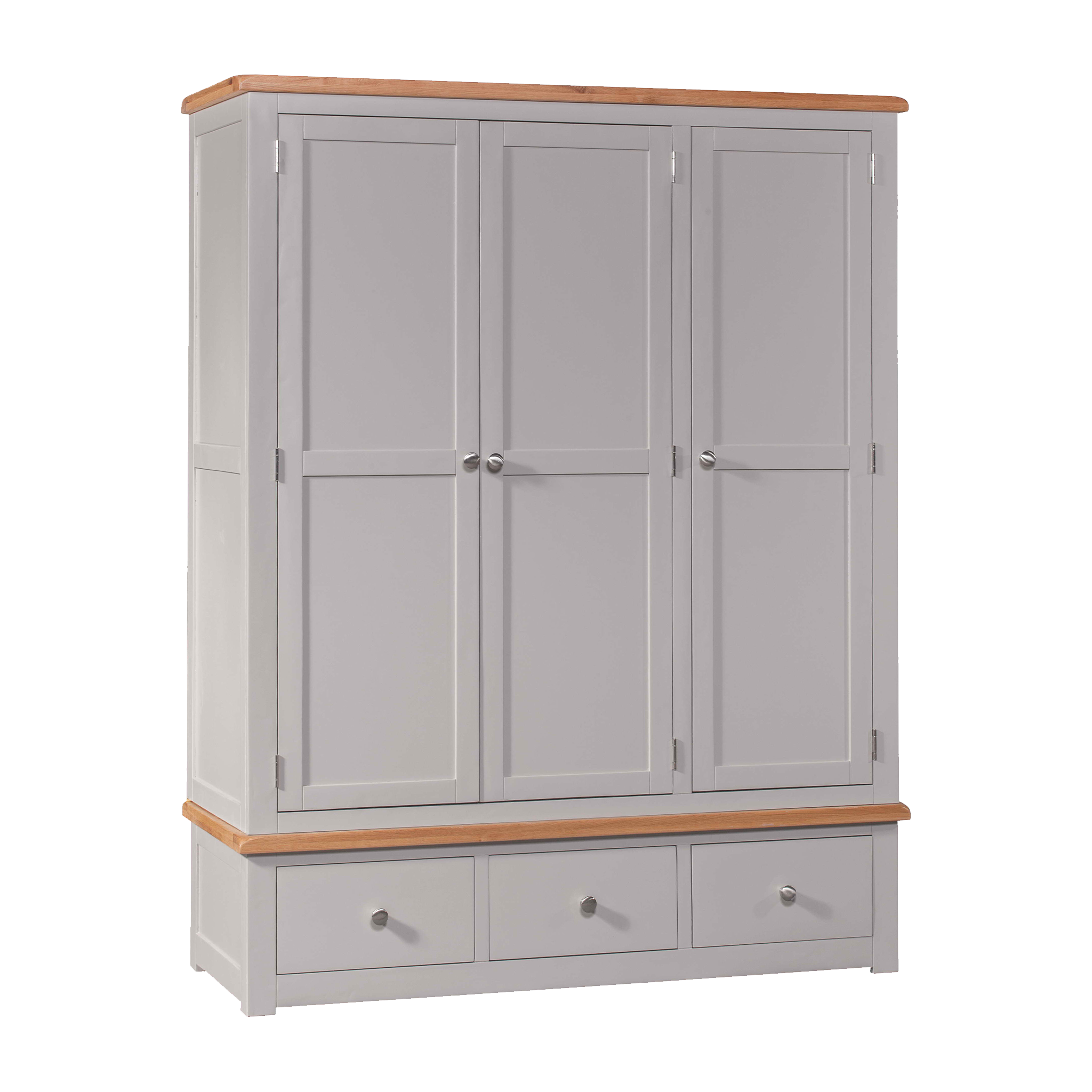 Enhance your bedroom with the elegant and spacious Diamond Triple Wardrobe. Crafted with precision, this wardrobe combines functionality with style to meet all your storage needs. The wardrobe section features three doors, revealing a generous hanging space with a wooden rail, while three lower drawers offer additional storage for your essentials. The wardrobe is expertly constructed primarily from pine, adorned with a clean, lacquered oak frame on the top and bottom, adding a touch of sophistication to your room.