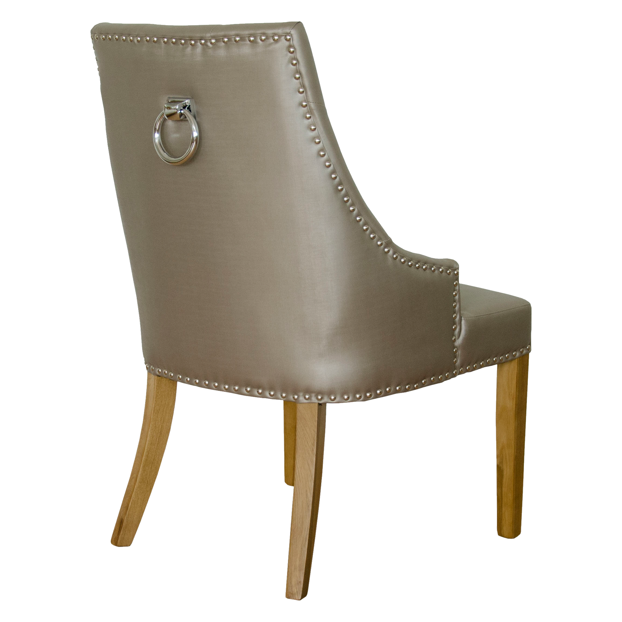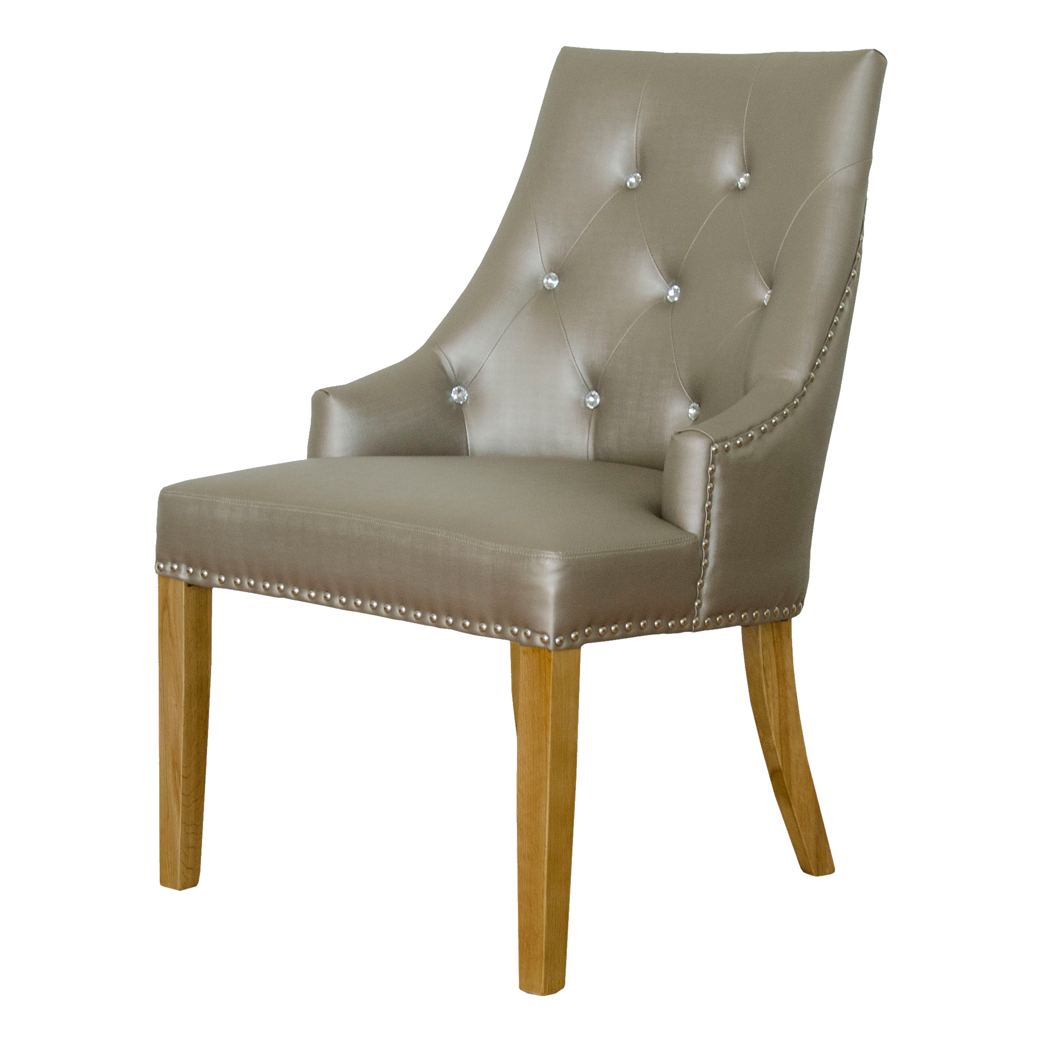 Enhance your dining space with the elegant Marjukka Stone Colour Chair. Crafted to exude sophistication, this chair is upholstered in luxurious stone-coloured leather, adorned with exquisite crystal buttons, and features a sleek chrome handle on the back. The oak legs, finished in a clear lacquer, provide a sturdy and stylish base for this chic chair, ensuring both durability and timeless appeal.