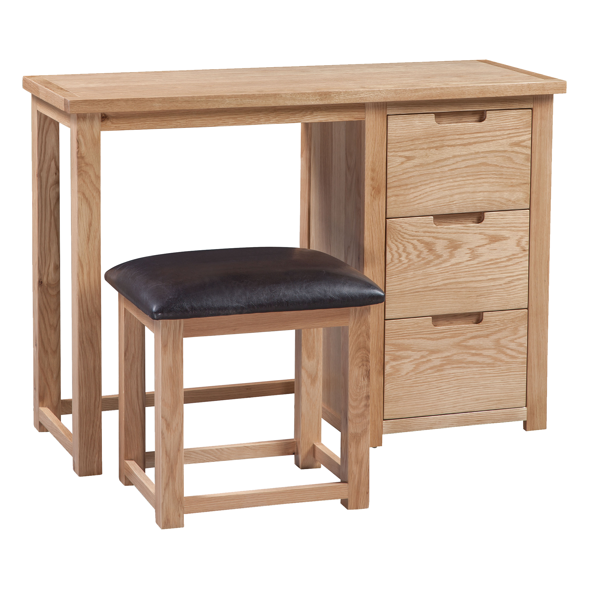 Enhance your bedroom with the sleek and stylish Moderna Dressing Table & Stool. Crafted from high-quality oak, this modern furniture piece exudes elegance and practicality. The dressing table features three spacious drawers, providing ample storage for your beauty essentials. The included stool ensures comfort as you get ready for the day ahead. Elevate your retail collection with the Moderna Dressing Table & Stool today!