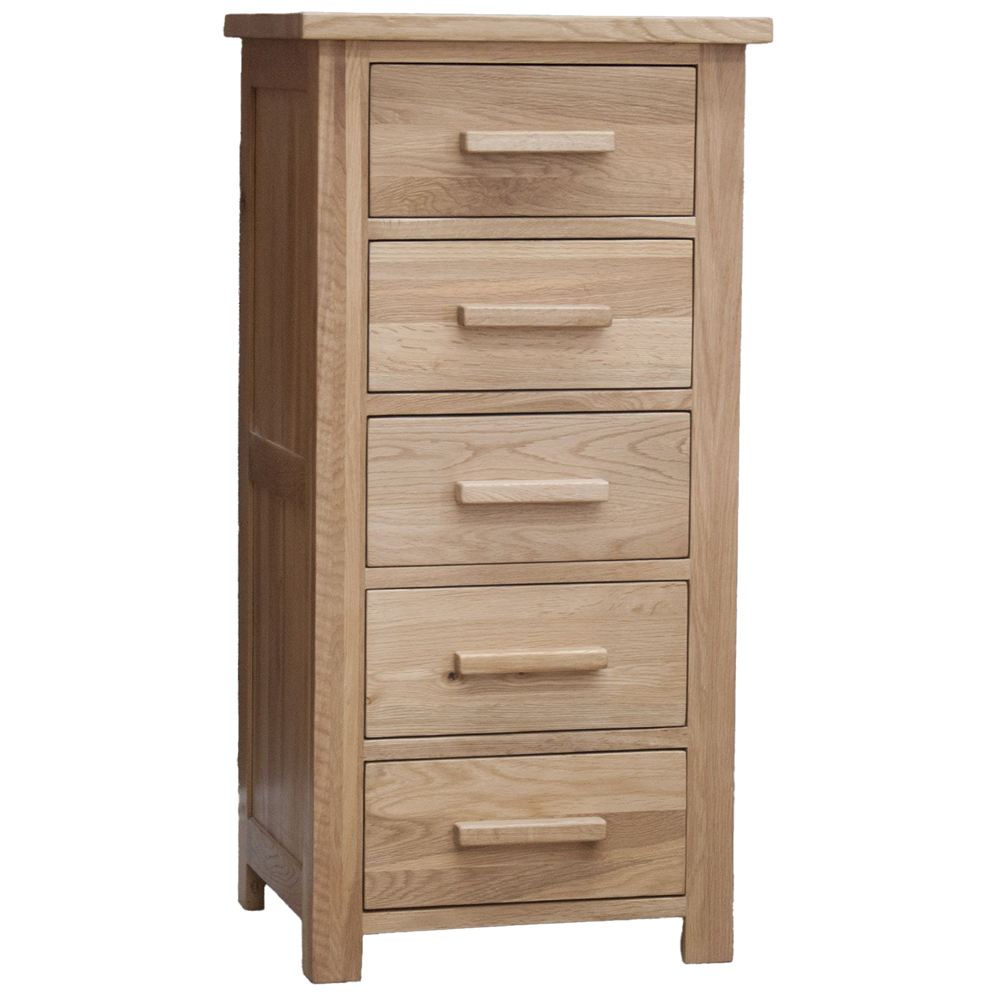 The Opus 5 Drawer Narrow Chest seamlessly combines timeless elegance with practical storage solutions. Crafted from 100% solid oak, this chest exudes durability and sophistication, ma it a stunning addition to any bedroom or living space. The five spacious dovetail drawers provide ample room to neatly organise your belongings, while the choice between metal handles (OPUMETHAN) or optional oak handles (OPUOAKHAN) allows you to customise the chest to suit your style.