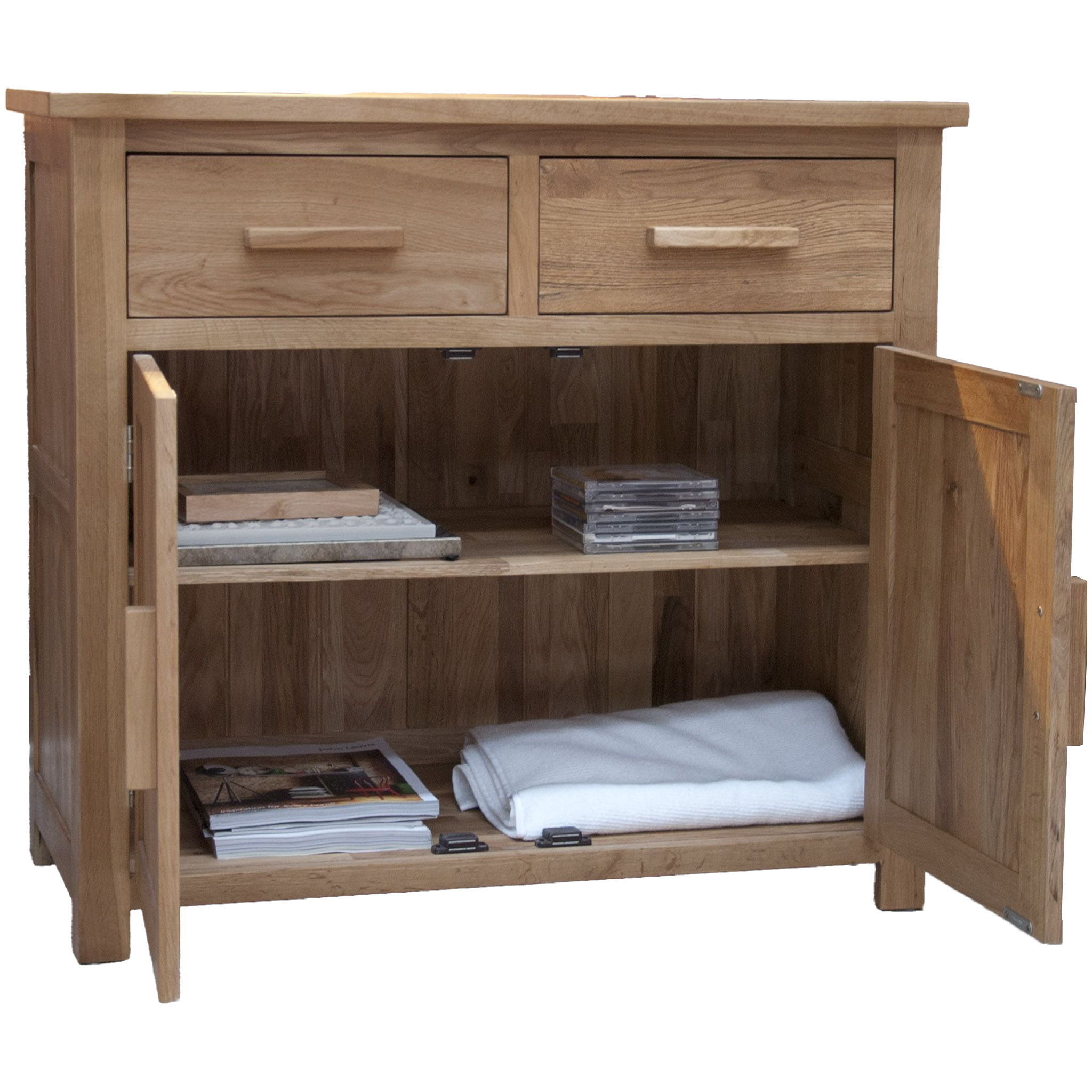 Enhance your living space with the exquisite Opus Small Sideboard, a stunning addition to any home. Crafted from 100% high-quality oak, this sideboard embodies elegance and functionality. Featuring two dovetail drawers, two doors, and an adjustable oak shelf, it offers generous storage for your belongings. The clear lacquer finish adds a touch of sophistication, ma it a versatile piece for any room.