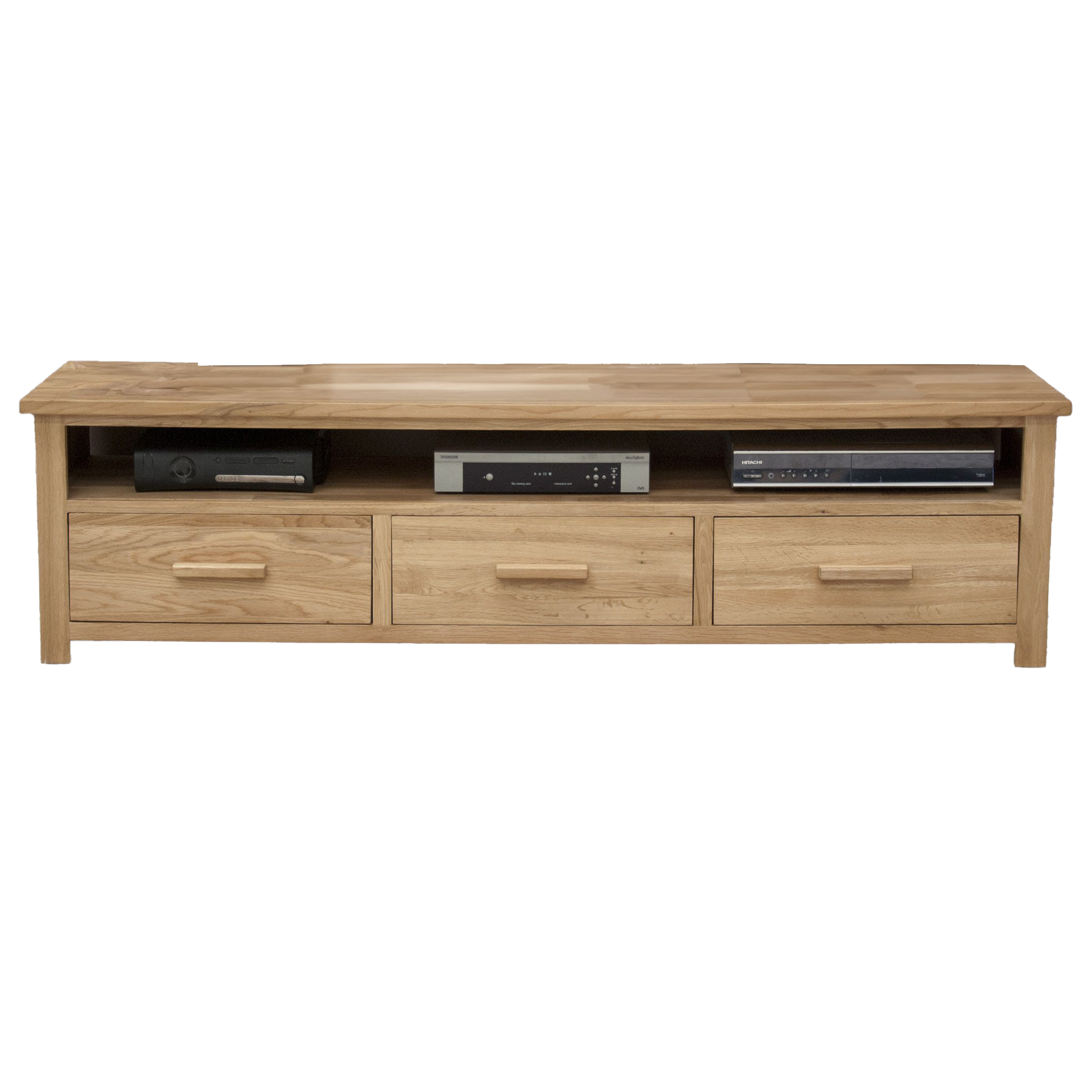 The three-drawer design of the Opus Wide Plasma Unit provides ample storage space for your media accessories, keeping your living room neat and organized. The metal handles add a modern touch to the classic oak construction. If you prefer a more traditional look, you can opt for the additional oak handles. Finished with a clear lacquer and featuring dovetail drawers, this TV cabinet is a true masterpiece of craftsmanship.