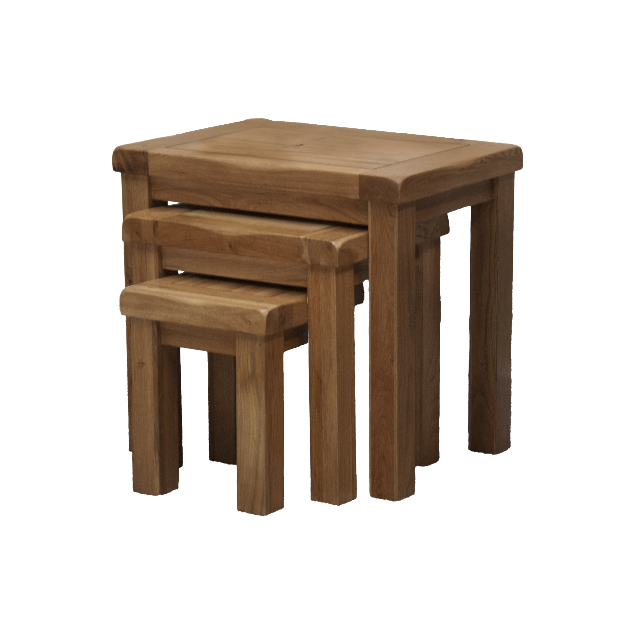 The Rustic Oak Nest of Tables brings a touch of timeless elegance to your living space. Crafted with high-quality oak, this set includes three tables of varying sizes to cater to your needs. The large table measures H 490mm W 520mm D 360mm, the medium table H 400mm W 390mm D 310mm, and the small table H 310mm W 260mm D 260mm. Each table features a stunning lacquer finish that enhances the natural beauty of the oak.