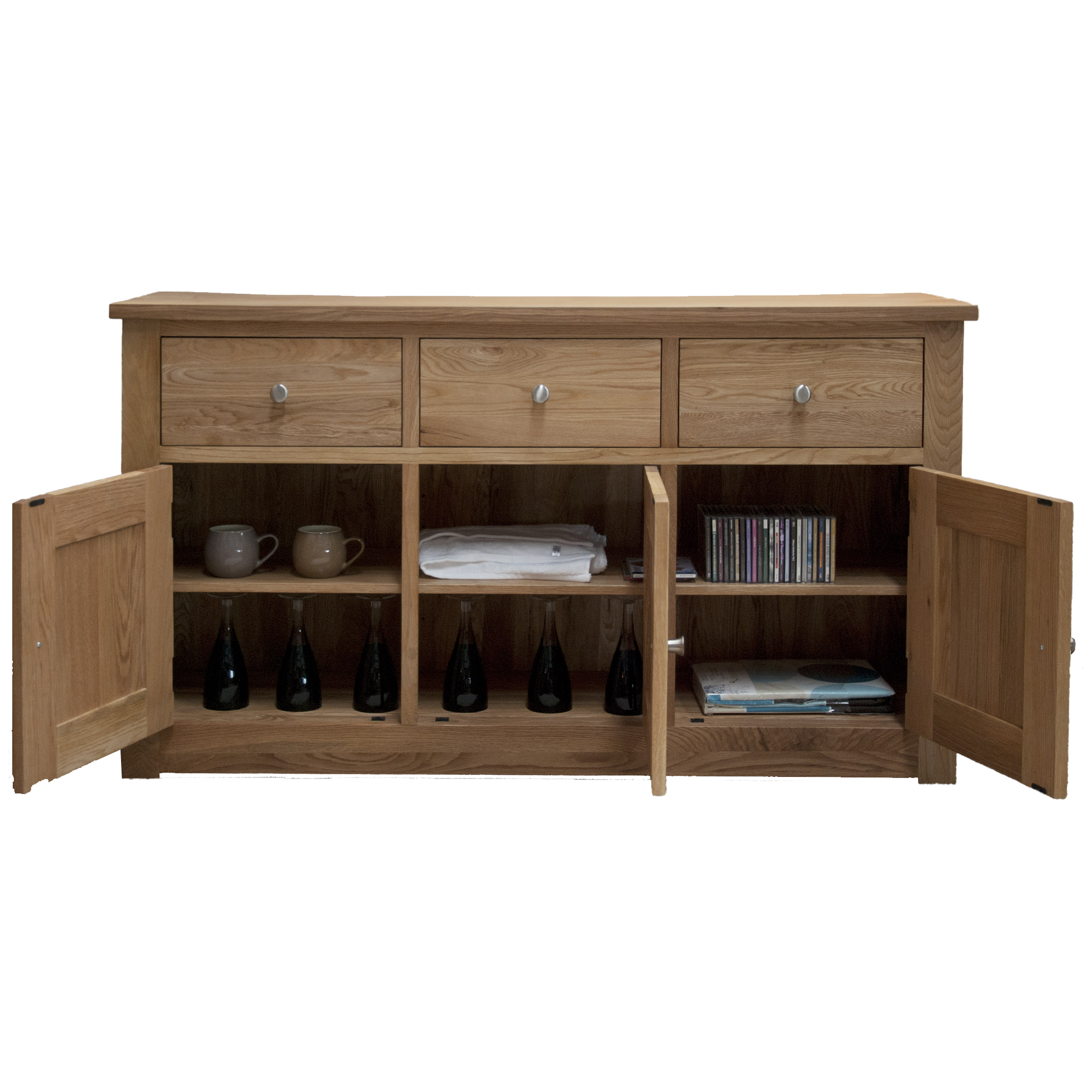 Measuring 890mm in height, 1590mm in width, and 450mm in depth, this sideboard is spacious yet sleek, ma it a versatile addition to your living or dining area. The Torino Large Sideboard comes with six metal knobs as standard, adding a touch of modernity to its classic design. For a more traditional look, you can opt to order additional oak knobs to complement the natural beauty of the oak wood.