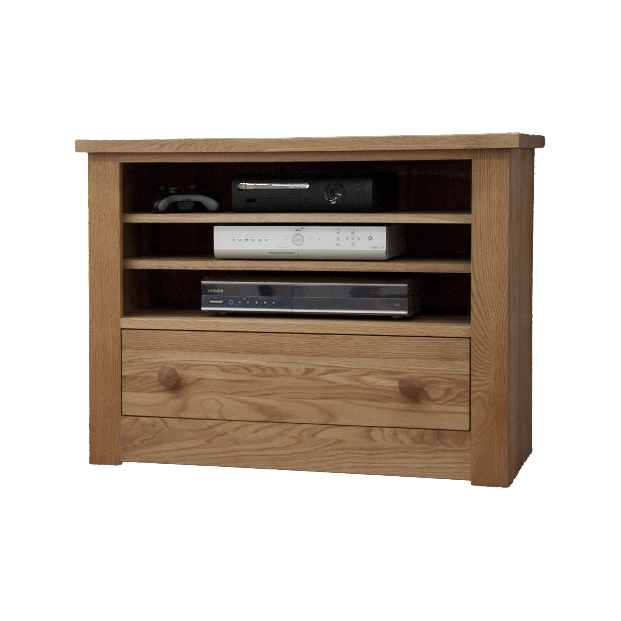 - Ample Storage: One dovetail wide drawer and two adjustable oak shelves for media organization