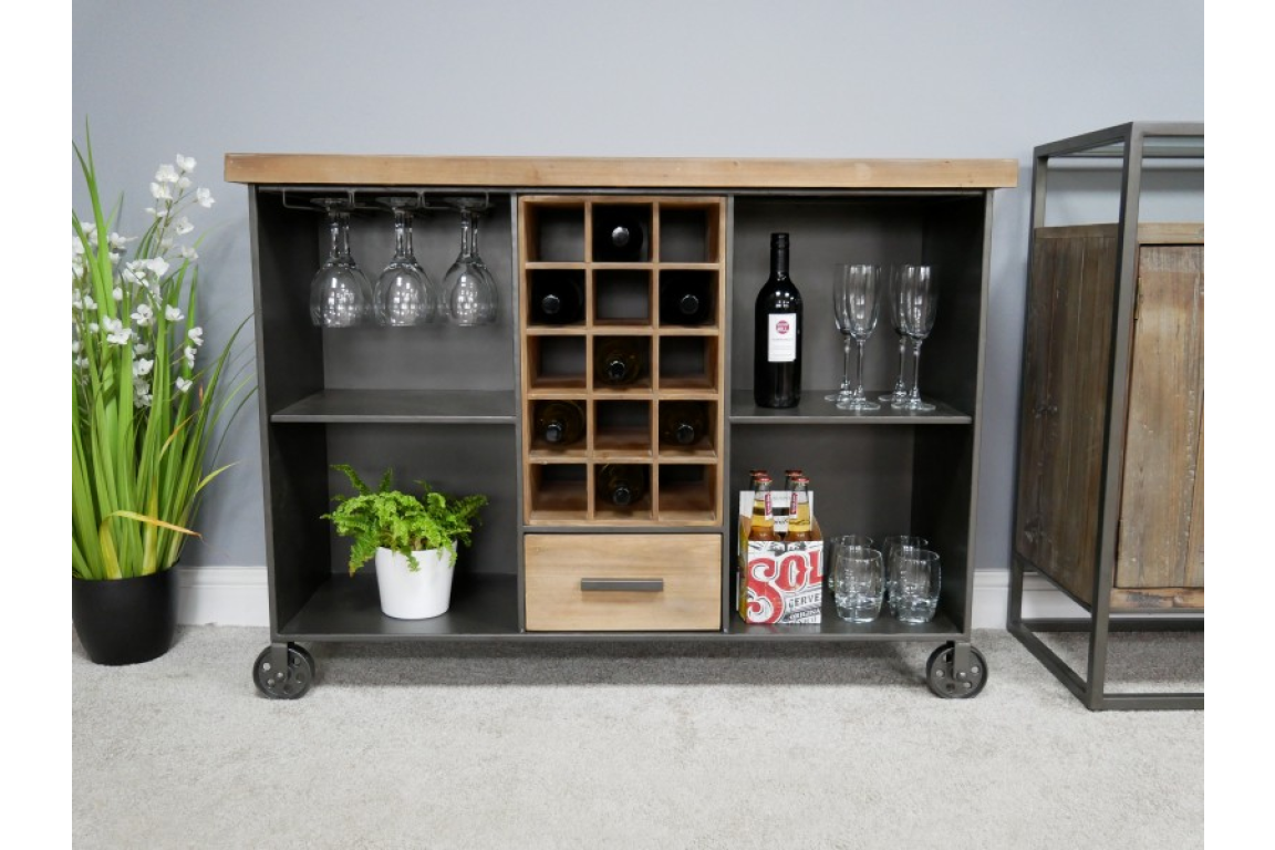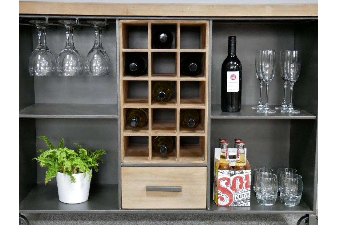 This wine cabinet exudes a rustic charm with its combination of metal and fir wood. The sleek metal frame provides stability and a modern touch, while the warm tones and natural grain of the fir wood panels add a cozy and inviting feel to any space. The clean lines and minimalist design make it a versatile piece that complements various interior styles, from industrial to farmhouse.