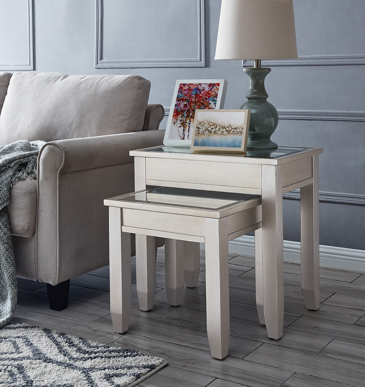 Add a touch of glamour to your living room with the Gallo Nest of Tables. The antique brass hardware and mirrored glass panels create a luxurious look, while the compact design is perfect for smaller spaces. Enjoy the convenience of no assembly required, allowing you to instantly elevate your decor with these stunning tables.