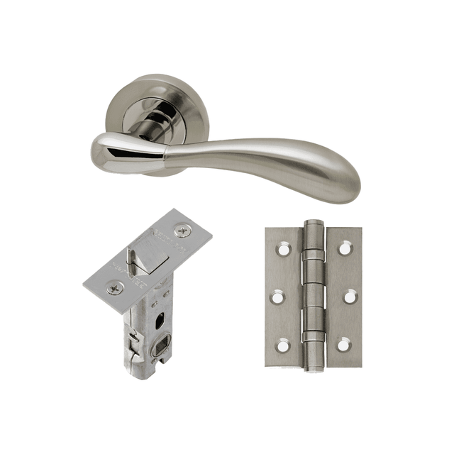The Venus Handle Hardware Pack, featuring polished chrome and satin nickel finishes, adds a sophisticated touch to internal doors. This essential set includes handles, hinges, and a tubular latch, blending style and practicality seamlessly.