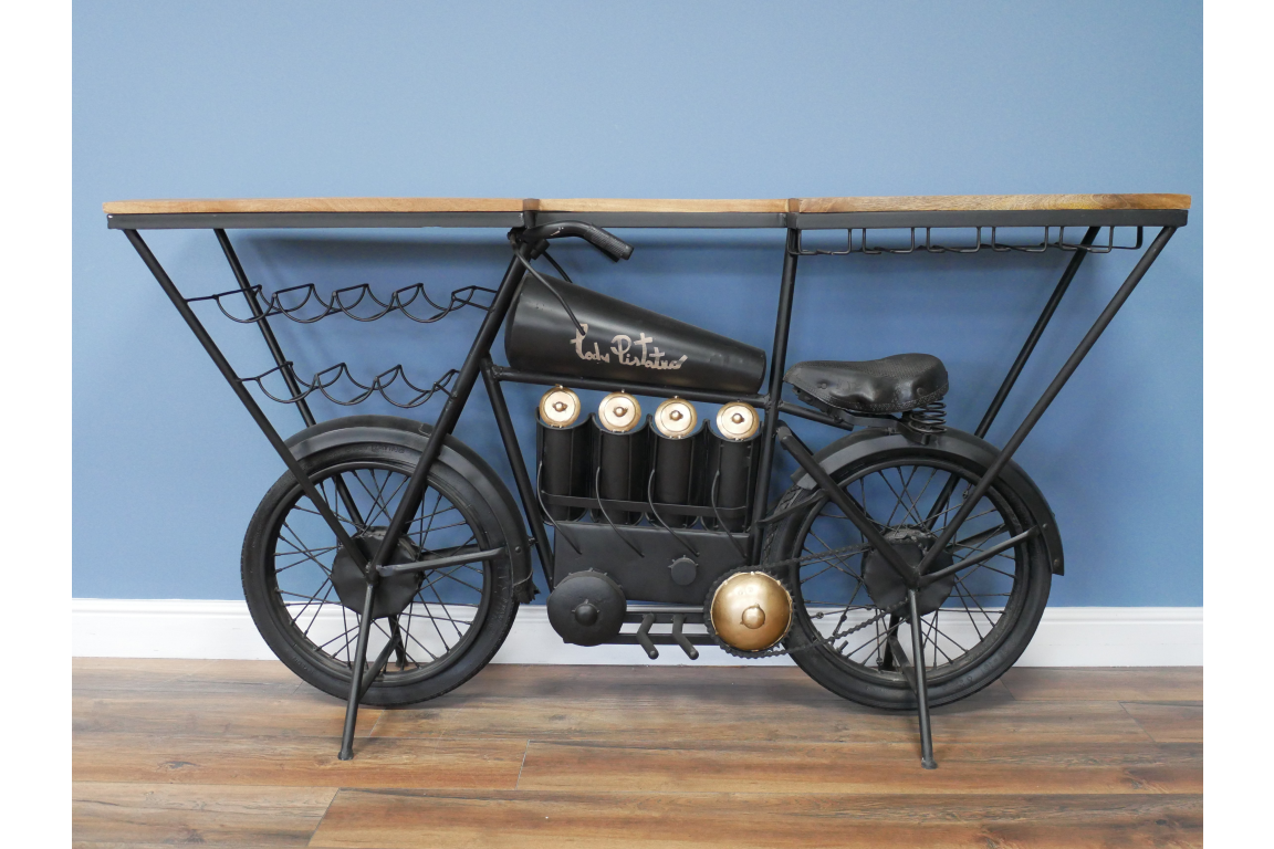 This versatile piece can be used as a bar table, serving station, or even as a decorative display in a living room or dining area. The Bike Bar's distinctive design makes it a conversation starter, perfect for gatherings and social events. Whether you're hosting a party or simply enjoying a casual drink, this bar is both functional and visually appealing.